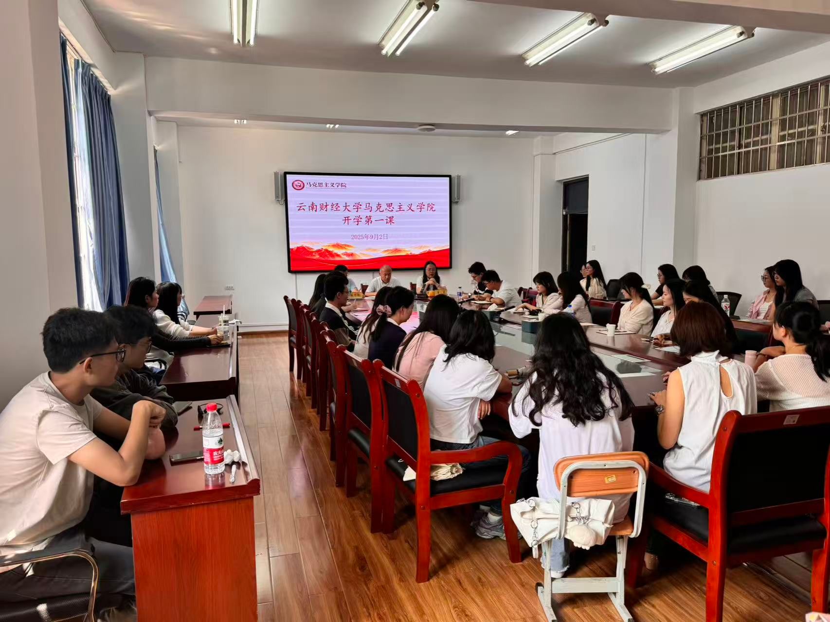 为引导研究生坚定理想信念、明确学业方向、增强安全意识,以良好状态开启新学期。9月2日,马克思主义学院举行“开学第一课”及主题教育班会,会议由院长宁乐锋主持,党委书记曾蕾以弘扬抗战精神为主题,为全体研究生讲授“开学第一课”,党委副书记兼纪委书记耿齐航开展安全教育和大学生宗教政策培训。