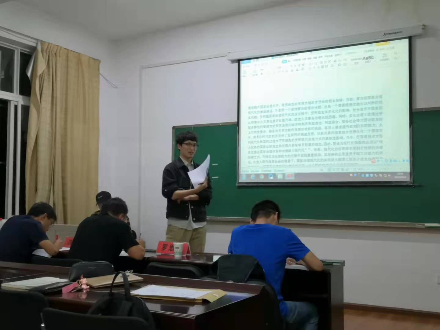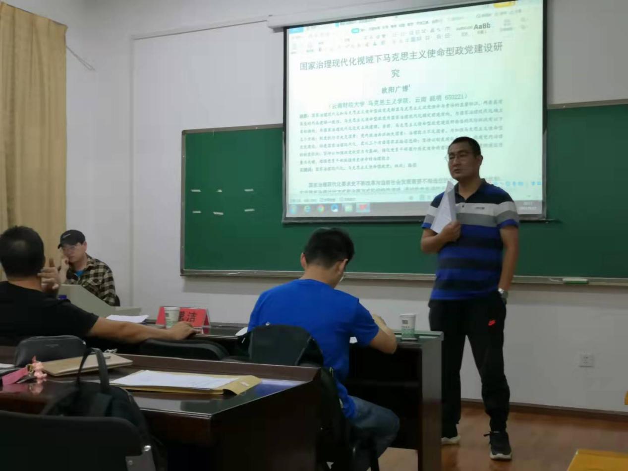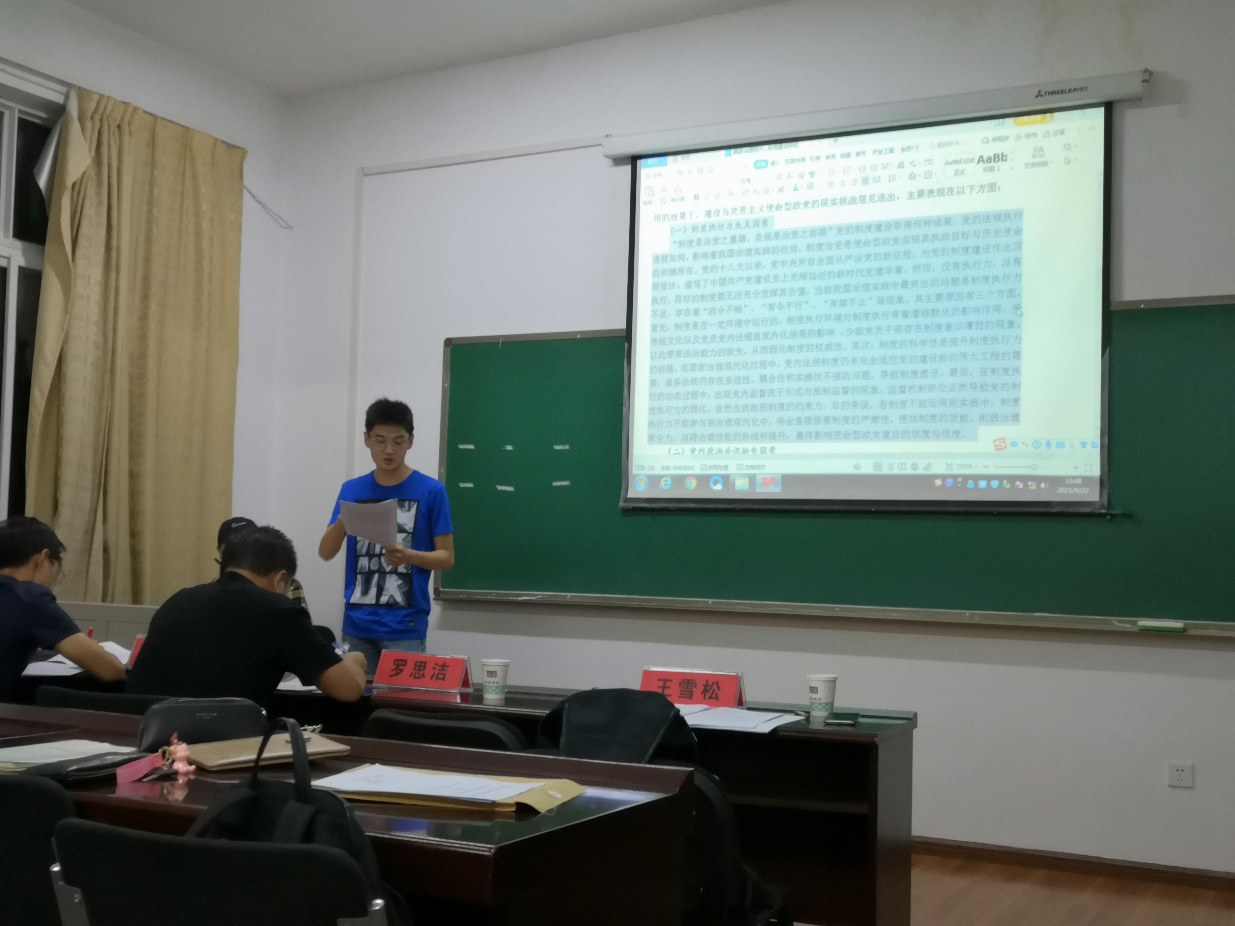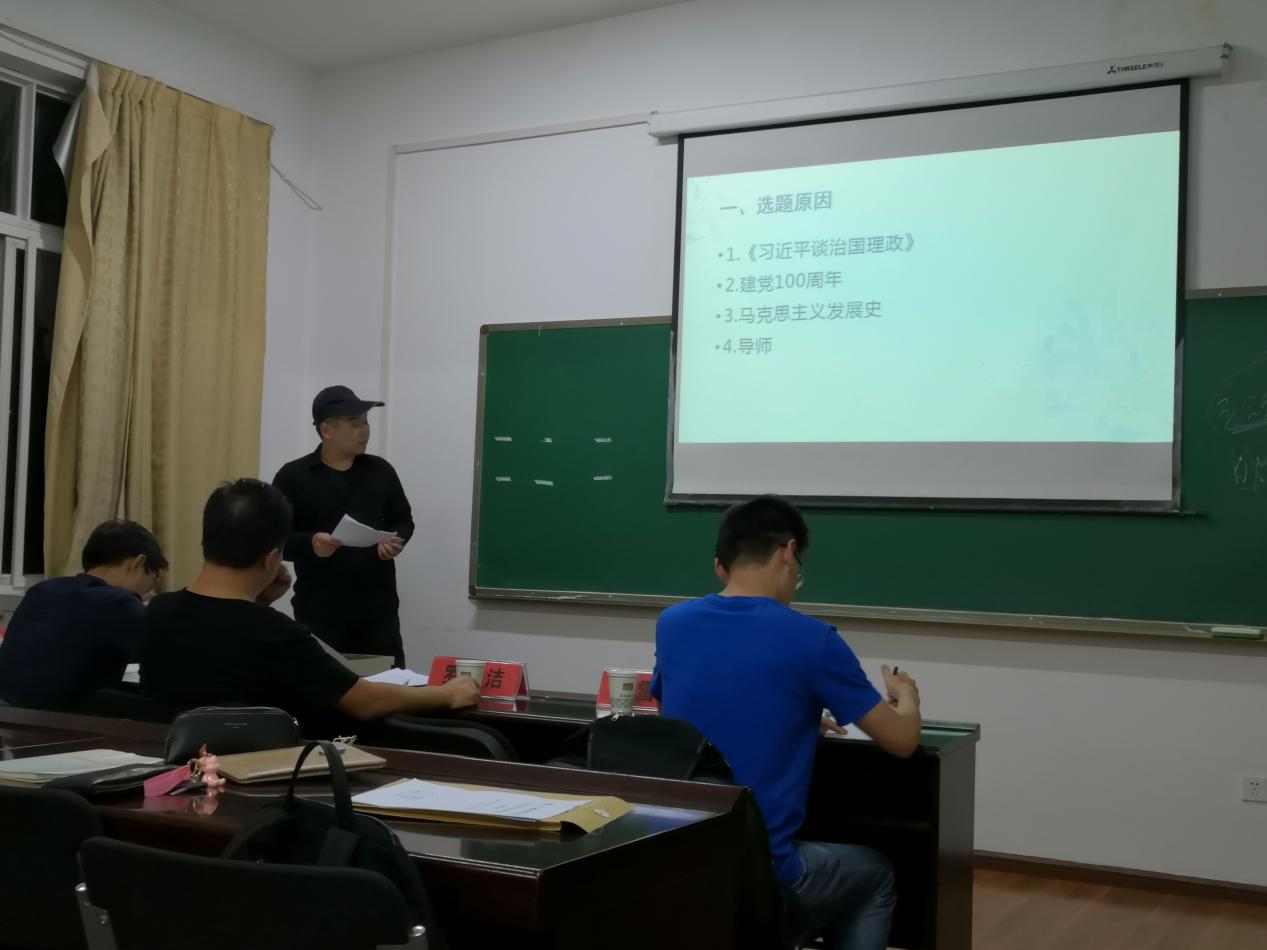 欧阳广博同学做了题目为《国家治理现代化视域下马克思主义使命型政党建设研究》的论文汇报,从研究背景、研究方法与创新之处、论文结构与主要内容、不足之处四个方面向大家介绍了论文的大致内容。