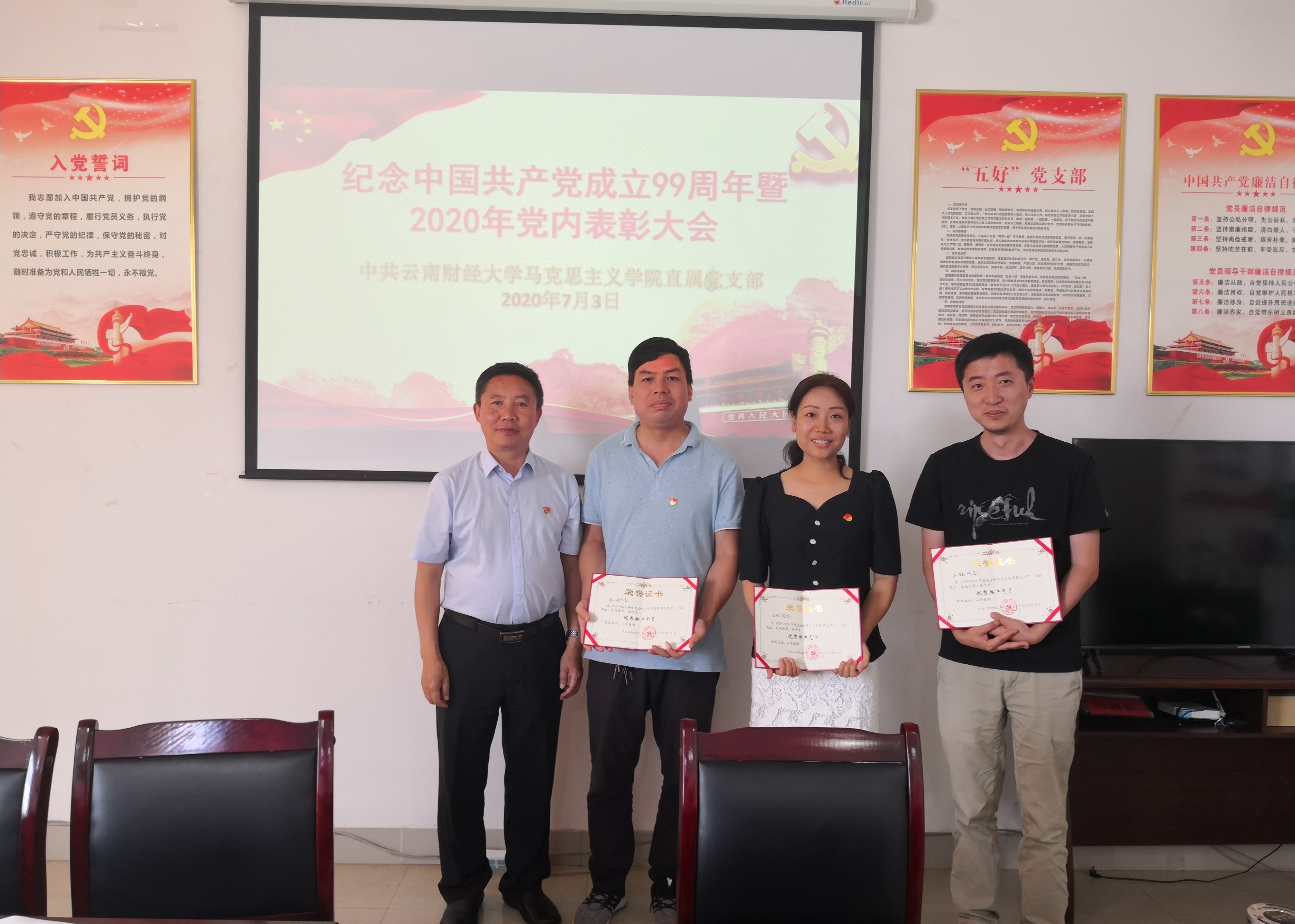 活动的第二项内容为党内表彰会。李亚军书记宣读学院《关于表彰2019-2020年度优秀共产党员的决定》,经各党小组推荐、纪检员初审、学院支委会议研究审定,评选出6名优秀共产党员。直属党支部委员、院长阮金纯为获奖个人颁发证书。