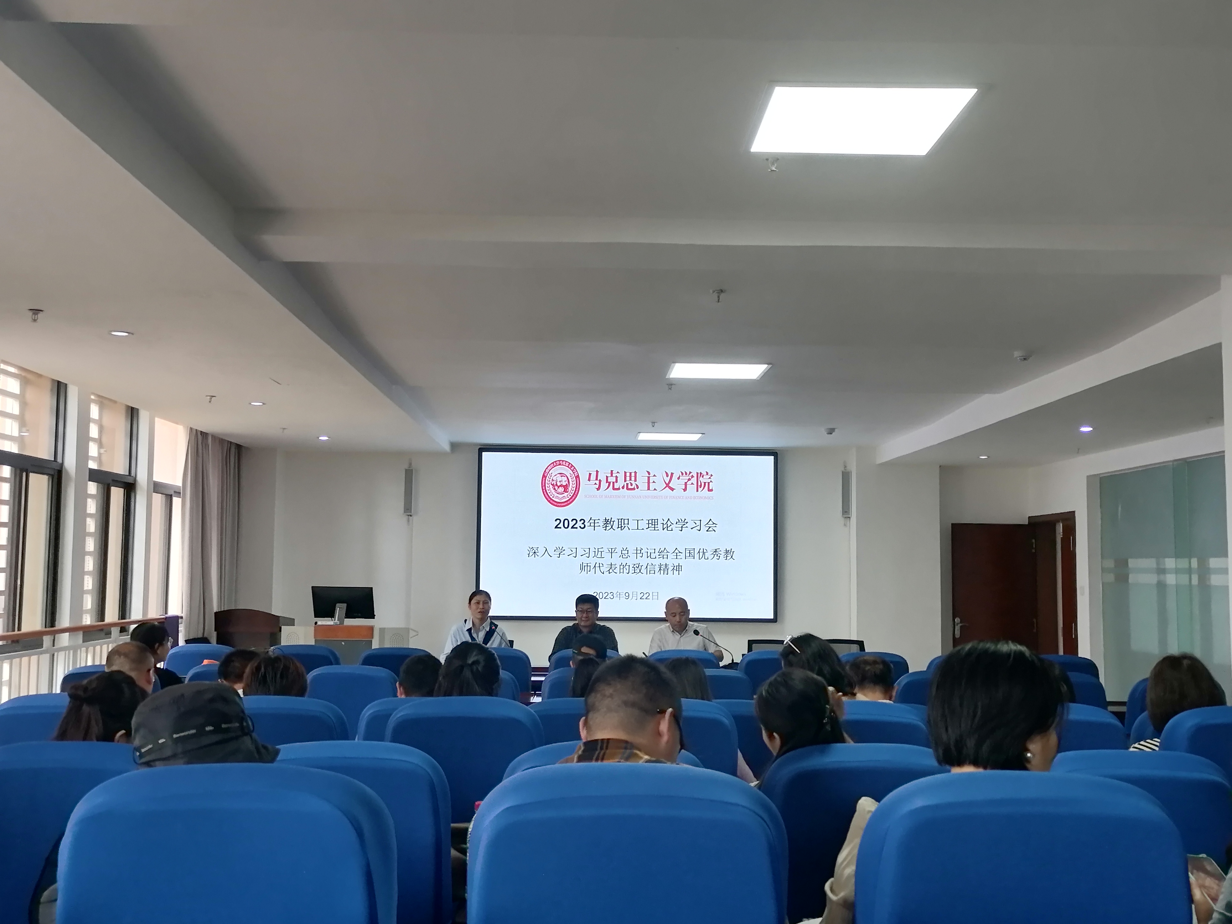 9月22日下午,马克思主义学院召开教职工理论学习会,专题学习习近平总书记给全国优秀教师代表的致信精神。学院党委书记李亚军领学,院长宁乐锋主持学习,学院全体教职工参加学习。