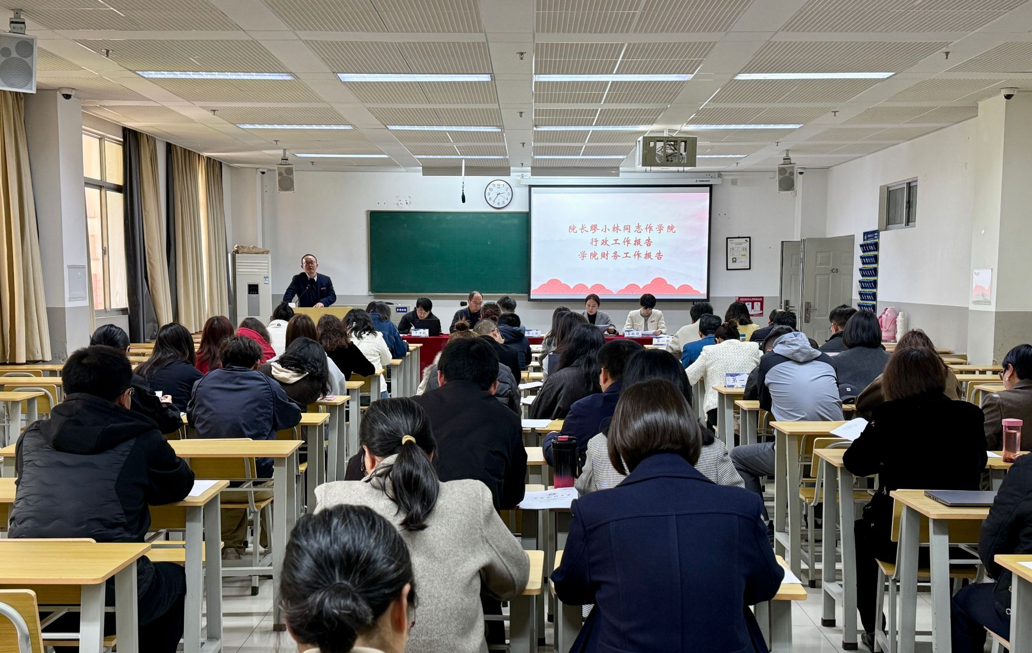 3月11日,财政与公共管理学院第二届第五次教职工暨工会会员大会在逸夫楼211举行。院长缪小林代表学院作题为《凝心聚力担使命 踔厉奋发谱新篇》的工作报告和财务报告,全面总结了学院2025年取得的成绩,科学规划2026年工作思路和重点任务,号召全体教职工锚定目标、攻坚实干,为把学院建设成为“三位一体”协同发展的高水平学院而努力奋斗,以优异成绩迎接“十五五”规划的良好开局。党委书记、分工会主席王晓芬作题为《履职尽责...