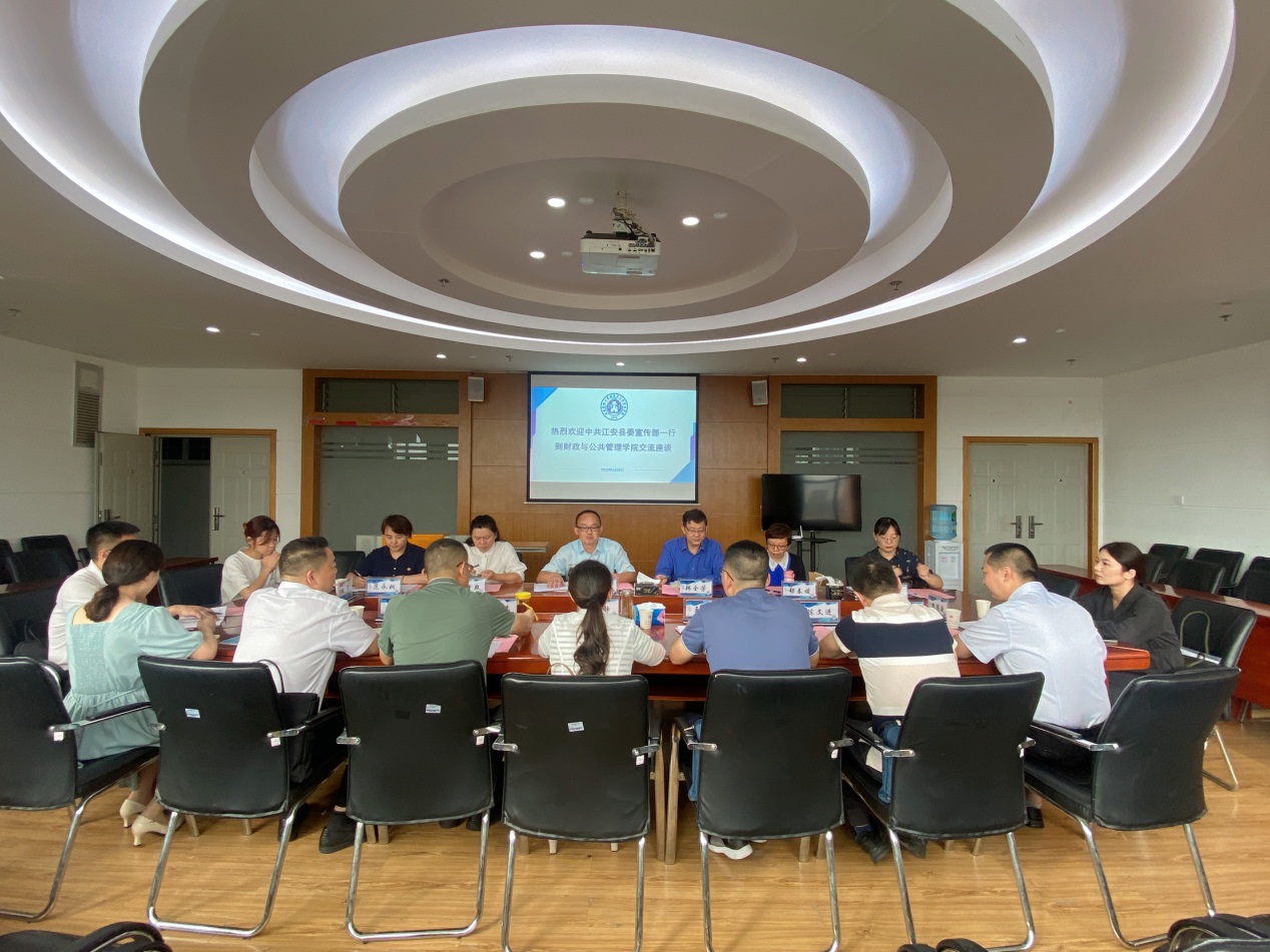 6月8日上午,由中共江安县委宣传部部长白静带队的四川宜宾市2023年第一期中青年干部培训班一行8人,到财政与公共管理学院开展调研交流。学院院长缪小林与来访一行举行座谈,学院副院长韩全芳、部分科室主任和专家教授参加。