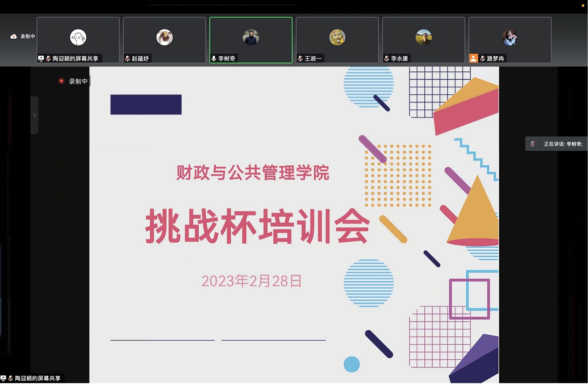 2月28日中午,财政与公共管理学院团委开展线上“挑战杯”培训会,本次培训会邀请学院郗春嫒、李永康、李树奇三位老师及朱雨轩、邓宗权两位同学开展培训和经验交流,辅导员王淑一主持会议。