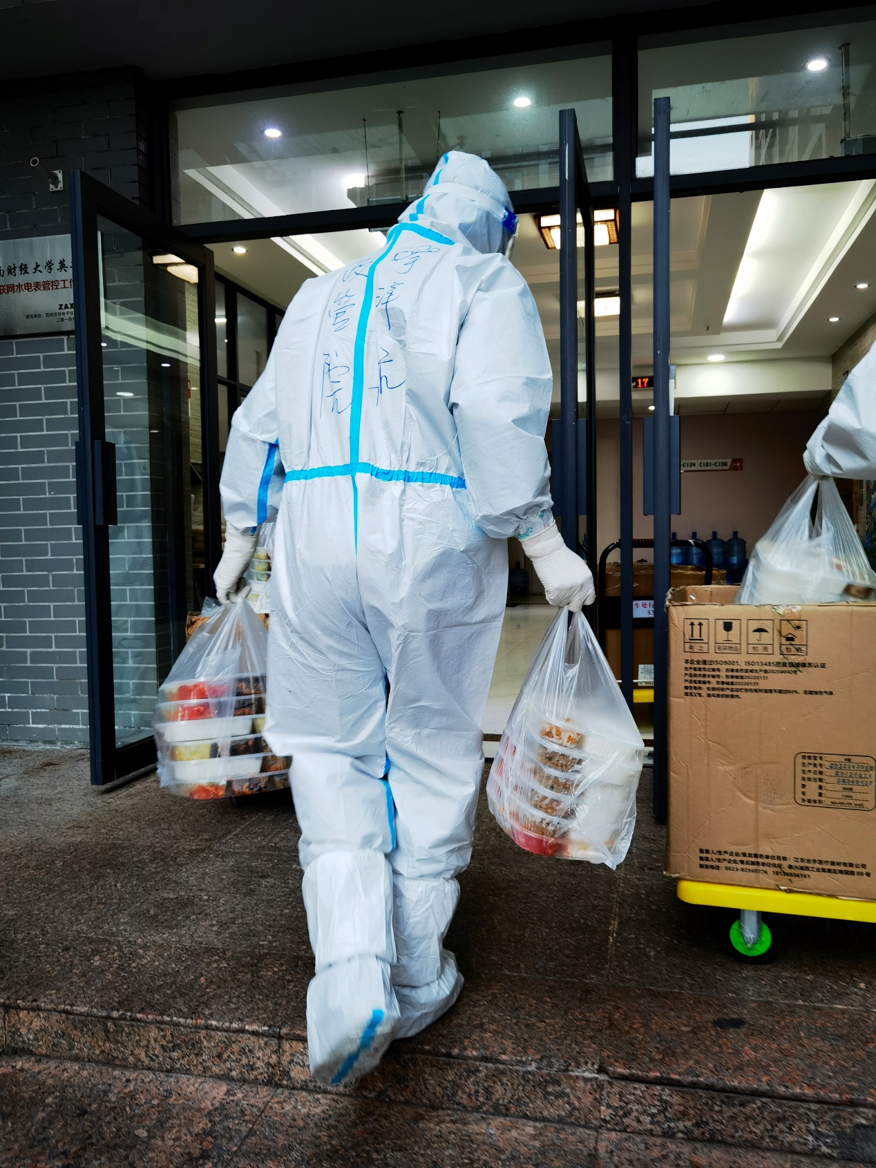 北院的志愿服务相对南院显得更加繁重,教师党员在其中发挥了先锋模范带头作用。启动临时管控当天,在北院的于洋航老师主动向学院请缨,加入了学校的志愿者队伍,投身到疫情防控工作第一线。他积极主动联系学院滞留在北院学生,关心大家的身心状况,为同学提供生活上的帮助。当熟悉的同学们看见送餐、送水的工作人员防护服上写着 “政管院于洋航”时,大家都非常地激动和感动。他经常鼓励自己班上的学生,“老师就在北院陪着你们,守护着你们,放心啊!”