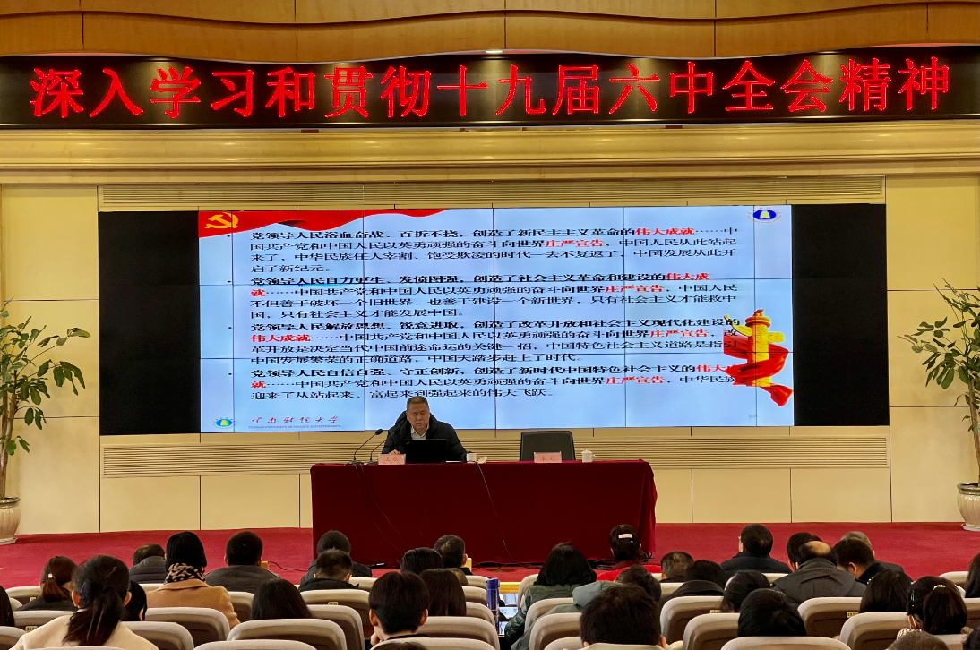 王敏全面梳理和系统概述了党的十九届六中全会公报全文,重点解读了十九届六中全会总结百年奋斗重大成就和历史经验的“三个需要”,回顾了中国共产党践行初心使命的百年历程,详细阐述了各个历史时期的任务与成就。他指出,党的十九届六中全会是我们党在成立一百周年的重要历史时刻,站在“两个一百年”奋斗目标的历史交汇点上召开的一次具有里程碑意义的重要会议。习近平总书记代表中央政治局所作的工作报告和发表的重要讲话,是以史为鉴、开创未来、实现中华民族伟大复兴的行动指南。全会通过的《中共中央关于党的百年奋斗重大成就和历史经验的决议》,回答了“过去我们为什么能够成功、未来我们怎样才能继续成功”的重大命题,是一篇极具引领力和感召力的马克思主义纲领性文献,是新时代中国共产党人牢记初心使命、坚持和发展中国特色社会主义的政治宣言。