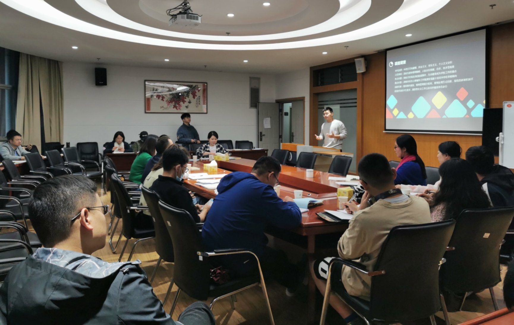 4月5日,财政与公共管理学院在南苑逸夫楼923举行大学生情绪辅导项目交流会。交流会由情绪辅导项目小组成员社会工作专业硕士研究生吴志平主讲,财政与公共管理学院党委副书记王晓芬、全体辅导员及班主任参会。