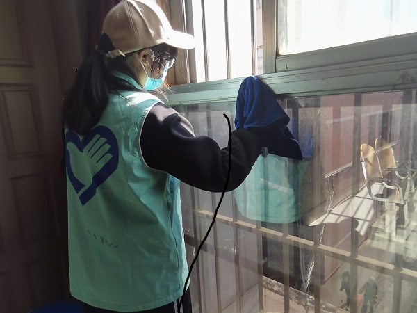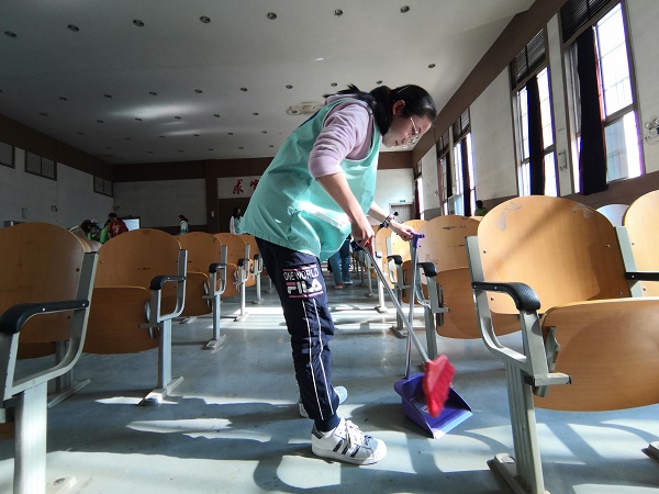 汇新礼堂中,志愿者们认真清扫拖洗地面,整理杂物,擦拭窗户、桌椅,清理过程中志愿者们发现不少乐器已经落灰生锈,杂乱的堆在礼堂的角落,于是找来食醋等适合清理乐器铁锈的物品,将乐器清理干净并有序摆放好。最后,志愿者们携手合作拖净了礼堂的地面,并仔细检查了礼堂的每一个角落。阳光从干净明亮的窗户透过,闪耀着志愿者们辛苦而满足的笑脸。