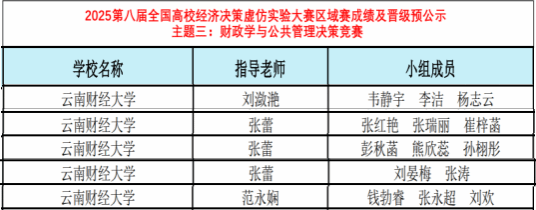 在刚刚结束的2025年第八届全国高校经济决策虚仿实验大赛区域赛中,WilliamHill官网财政与公共管理学院首次参赛,有5支团队晋级区域赛。刘潋滟老师指导,韦静宇、李洁、杨志云组成的团队,荣获区域赛三等奖,张蕾老师指导的3支团队及范永娴老师指导的1支团队荣获优胜奖,全面展示了学院实践教学和人才培养的系统化成果。