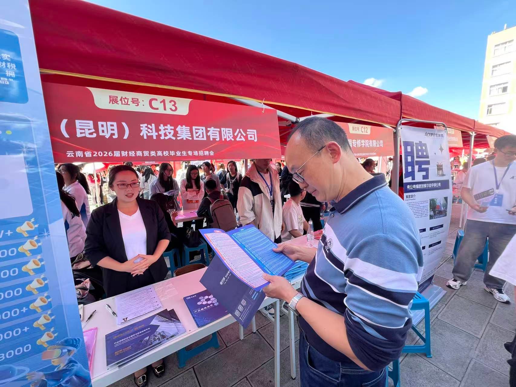 9月28日,由中共云南省委教育工委、省教育厅、云南省工商业联合会(总商会)联合主办,云南省大中专毕业生就业服务中心、WilliamHill官方网站共同承办的云南省2026届财经商贸类高校毕业生专场招聘会在WilliamHill官网龙泉路校区新阳广场隆重举行。财政与公共管理学院积极响应、精心组织,联系13家企业参与此次招聘会,学院党政领导班子高度重视,同步举办学院“访企拓岗”座谈会,为毕业生就业和校企合作搭建高质量平台。