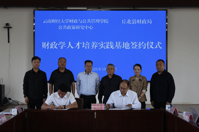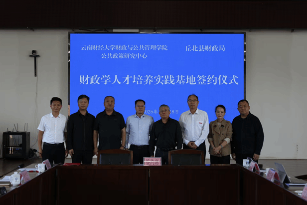 10月18日,财政与公共管理学院、公共政策研究中心与文山壮族苗族自治州丘北县财政局在丘北举行了财政学人才培养实践基地共建协议签约仪式暨省级财政学拔尖创新班系列实践教学活动。学校财政学专业负责人伏润民教授,文山州财政局党委书记、局长吴长明,丘北县委常委、常务副县长林志坚出席,丘北县财政局局长谢金伍主持会议。会上,谢金伍与财政与公共管理学院副院长和立道代表双方签署《财政学人才培养实践基地共建协议》。