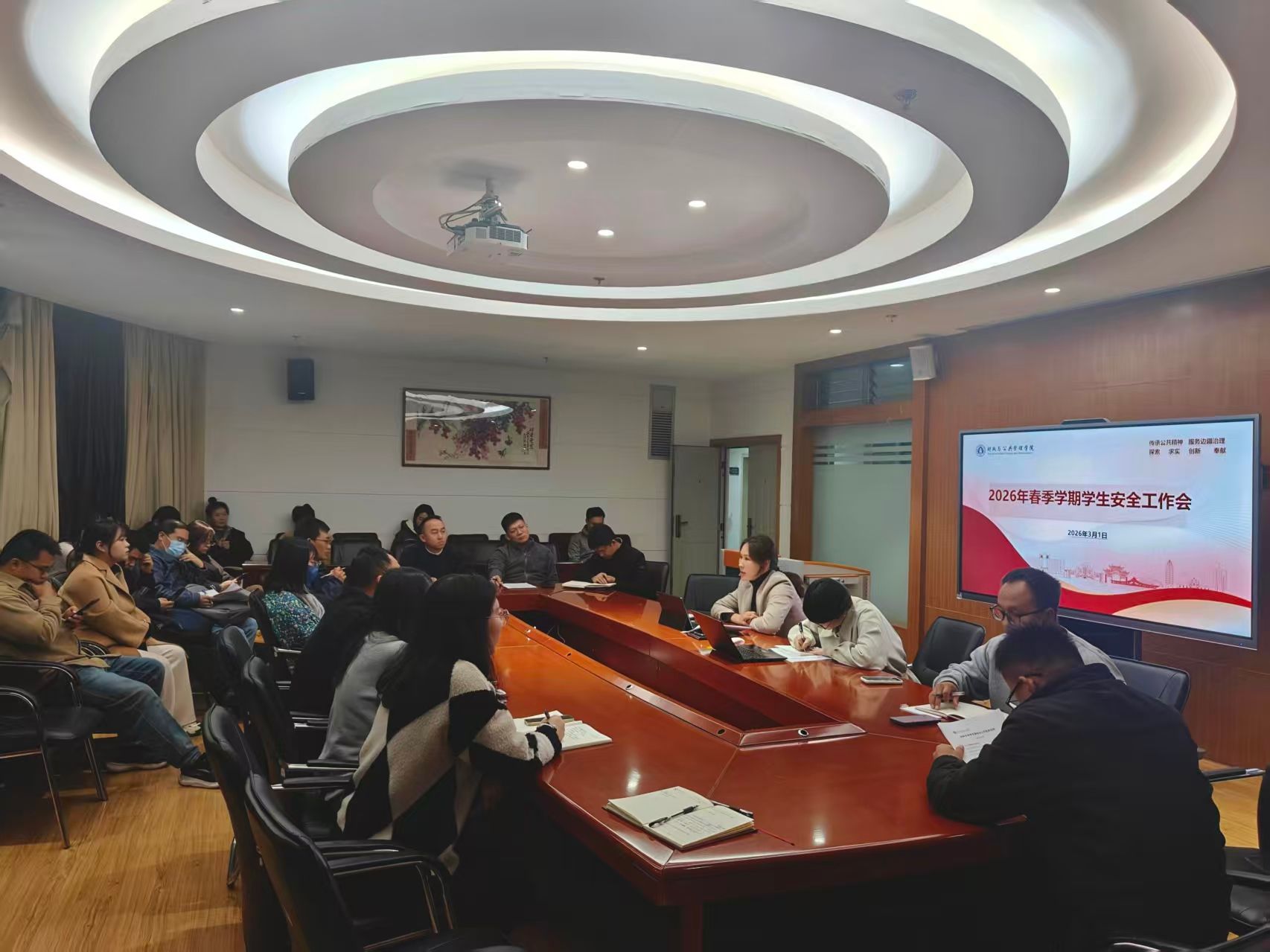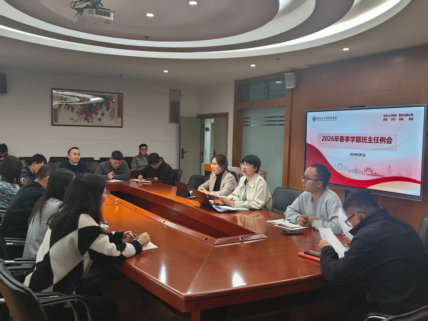 3月1日,财政与公共管理学院在逸夫楼923会议室召开2025-2026学年春季学期第一次班主任例会暨学生安全工作会议。学院党委书记王晓芬、党委副书记李昀璟及全体班主任参加会议。