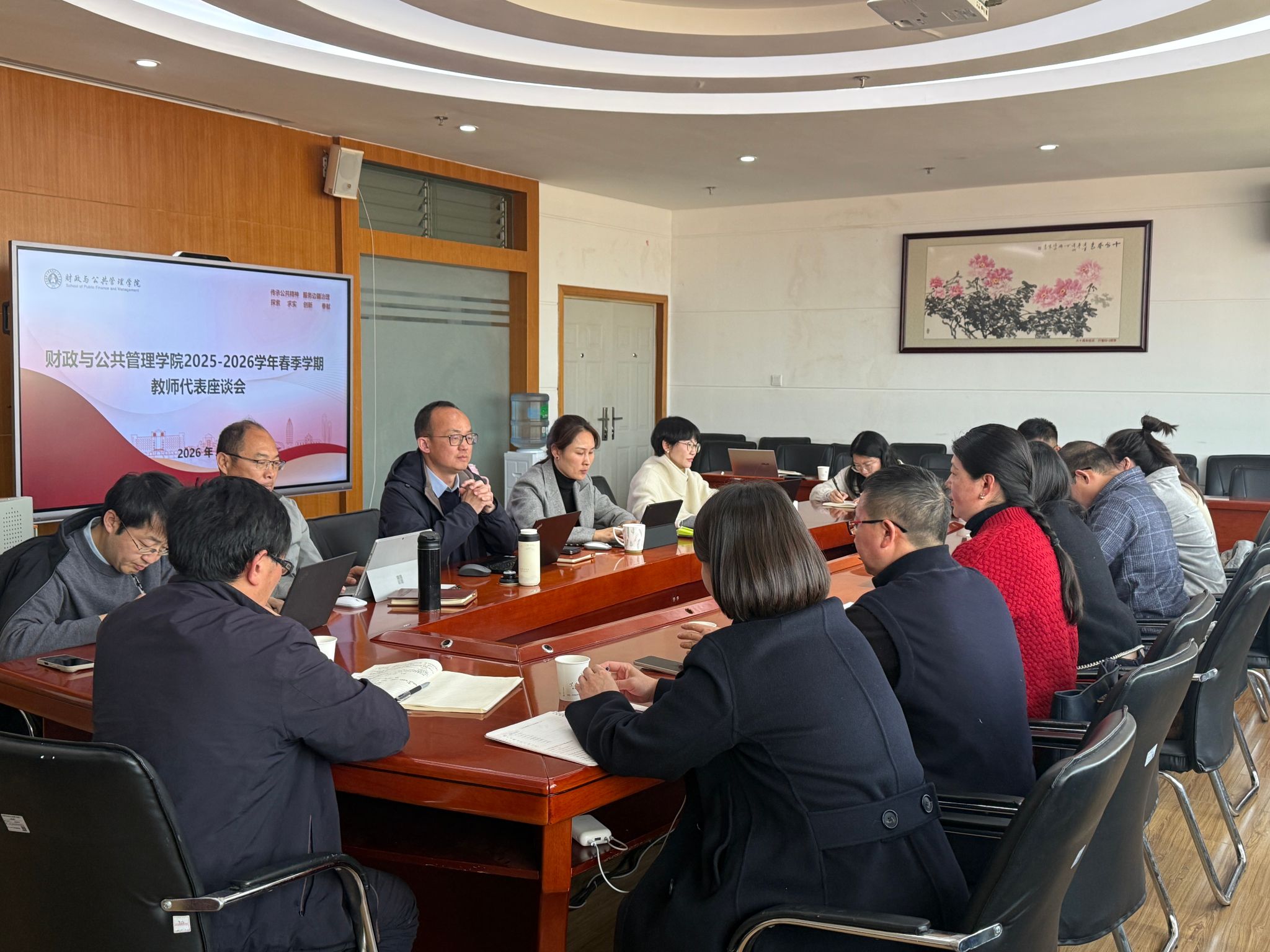 为进一步倾听师生心声,凝聚发展共识,3月4日,财政与公共管理学院在逸夫楼923会议室召开2025-2026学年春季学期师生代表座谈会。学院领导班子成员、学院教师及学生代表分阶段参加会议。