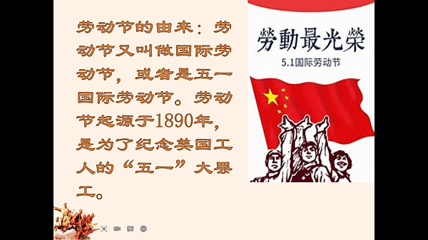 该活动主要分为两个环节。首先,唐家辉同学向各位同学进行了劳动节的科普,讲解了劳动节的由来,使得同学们对五一劳动节有了更加深刻的认识。随后,活动进行到了第二个环节劳动过程展示与分享。几位同学就自己的劳动成果进行了展示,并且分享了自己在劳动后的心得体会。展示包括:扫地,为家人包饺子,锄地等多种多样的劳动形式,体现了当代大学生的青春活力与劳动热情,体现了“劳动光荣"的团日主题,为各位同学树立了良好的学习榜样。