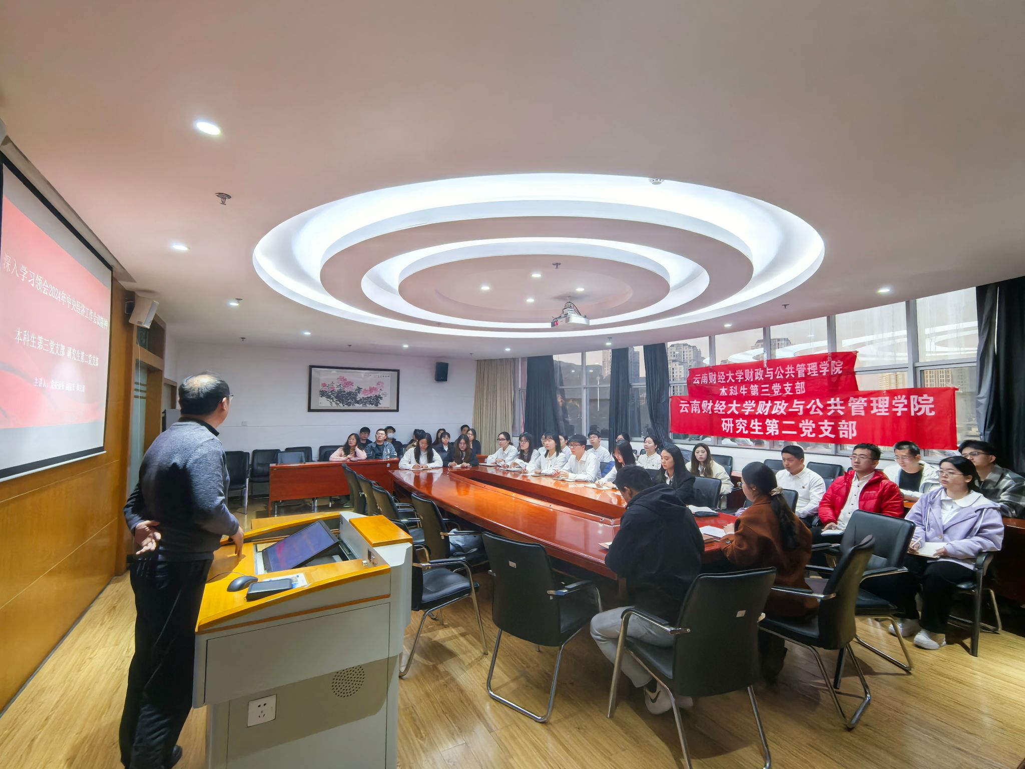 12月24日,财政与公共管理学院本科生第三党支部与研究生第二党支部于逸夫楼923开展“深入学习领会2024年中央经济工作会议精神”专题党课活动。本次党课由和立道副院长主讲,本科生第三党支部、研究生第二党支部全体同志参加学习。