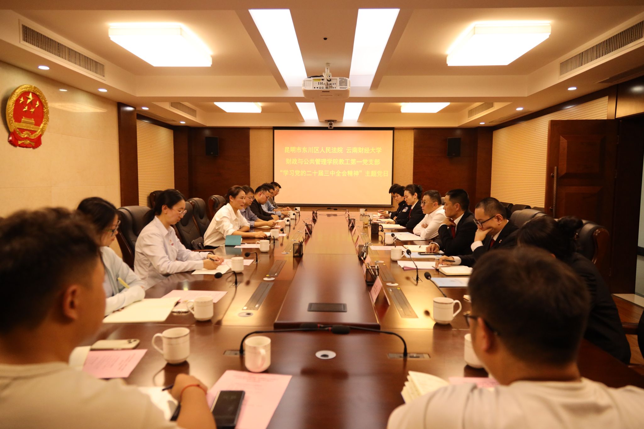 10月24日,师生党员与东川区人民法院联合开展了“学习党的二十届三中全会精神”主题党日活动。东川区人民法院党组书记、院长王勇,党组成员、政治部主任李习宾,综合办公室负责人方媛及青工委干警代表参加活动。座谈会上,王勇介绍了东川区人民法院基本情况及“五铜”支部党建品牌,分享了汤丹人民法庭创建“枫桥式人民法庭”的做法及成效。王晓芬介绍学院办学情况、党建工作体系等,她表示,希望以此次党建共建活动为契机,双方增进了解与联系,加强在科研项目、人才培养等方面的合作。双方围绕党建引领、法治建设等方面进行深入交流研讨。