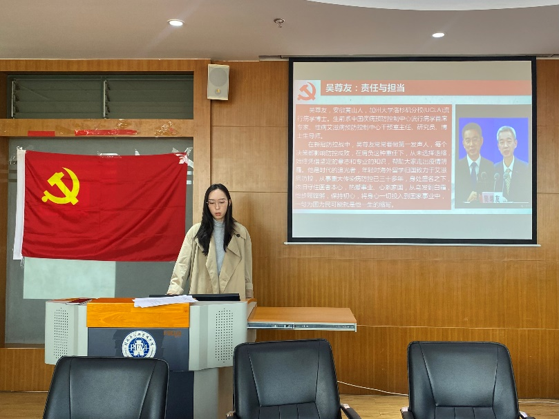 预备党员朱梦蕾同志以吴尊友在疫情期间恪尽职守的事迹为例,号召同志们在新时代要有新担当新作为,努力学习,积极投身到全面建成社会主义现代化强国的实践中,为实现中华民族伟大复兴的中国梦而奋斗。