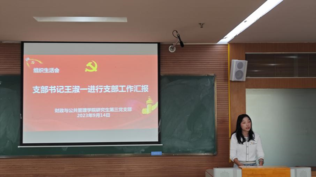 2023年9月14日下午,财政与公共管理学院研究生第三党支部在逸夫楼706召开“加强党性修养,做新时代党员”的专题组织生活会。参加此次会议的有财政与公共管理学院党委委员和立道老师、研究生第三党支部书记王淑一老师、全体支委和各党员同志,会议由支部副书记龚云垚同志主持。