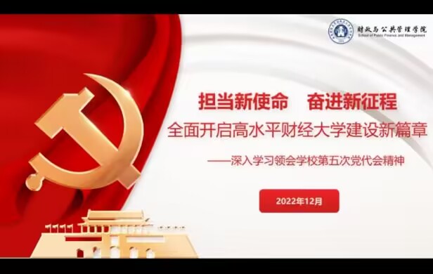 2022年12月15日,财政与公共管理学院研究生第二党支部在腾讯会议上开展主题党日活动,深入学习领会学校第五次党代会精神。活动由支部书记毛丹主持,研二党小组李政豪同志担任主讲。