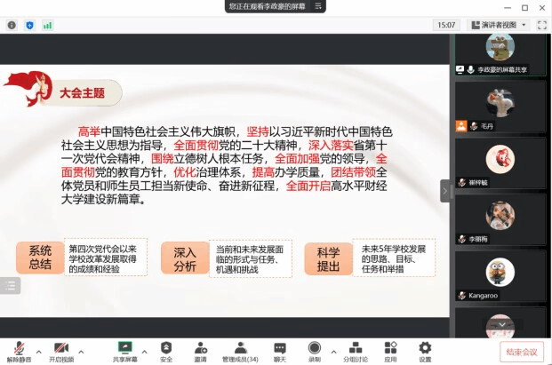 李政豪同志带领支部党员从大会主题、九项主要成绩、三项重大成果、“1186”战略等四方面深入学习领会学校第五次党代会精神。与会党员纷纷发表感想,他们表示通过此次学习,进一步加深了对学校的了解,意识到自己身上肩负的使命,今后将更加坚定理想信念,奋斗拼搏,为学校发展贡献自己的力量。