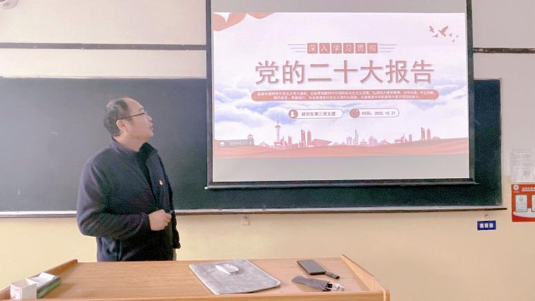 2022年10月21日,财政与公共管理学院研三党支部邀请学院党委委员和立道讲授“学习党的二十大报告”专题党课,此次党课于南院逸远楼东104开展,全体支部党员积极参加。