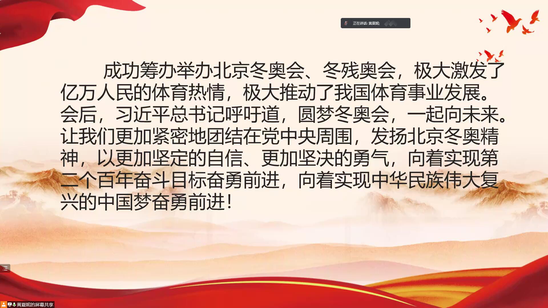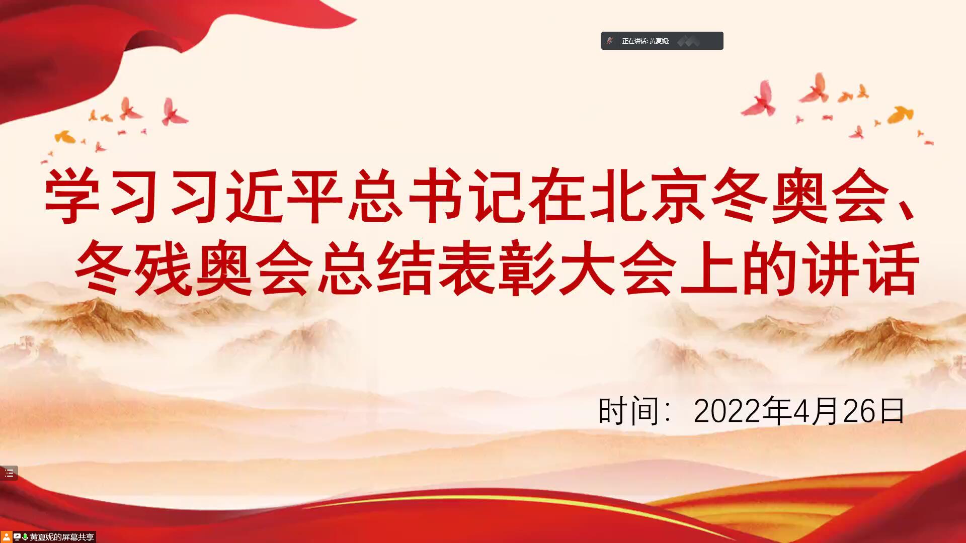 2022年4月26日下午2点,财政与公共管理学院本科生第四党支部通过腾讯会议召开四月份主题党日活动,支部全体党员学习了习近平总书记在北京冬奥会、残奥会总结表彰大会上的讲话精神。