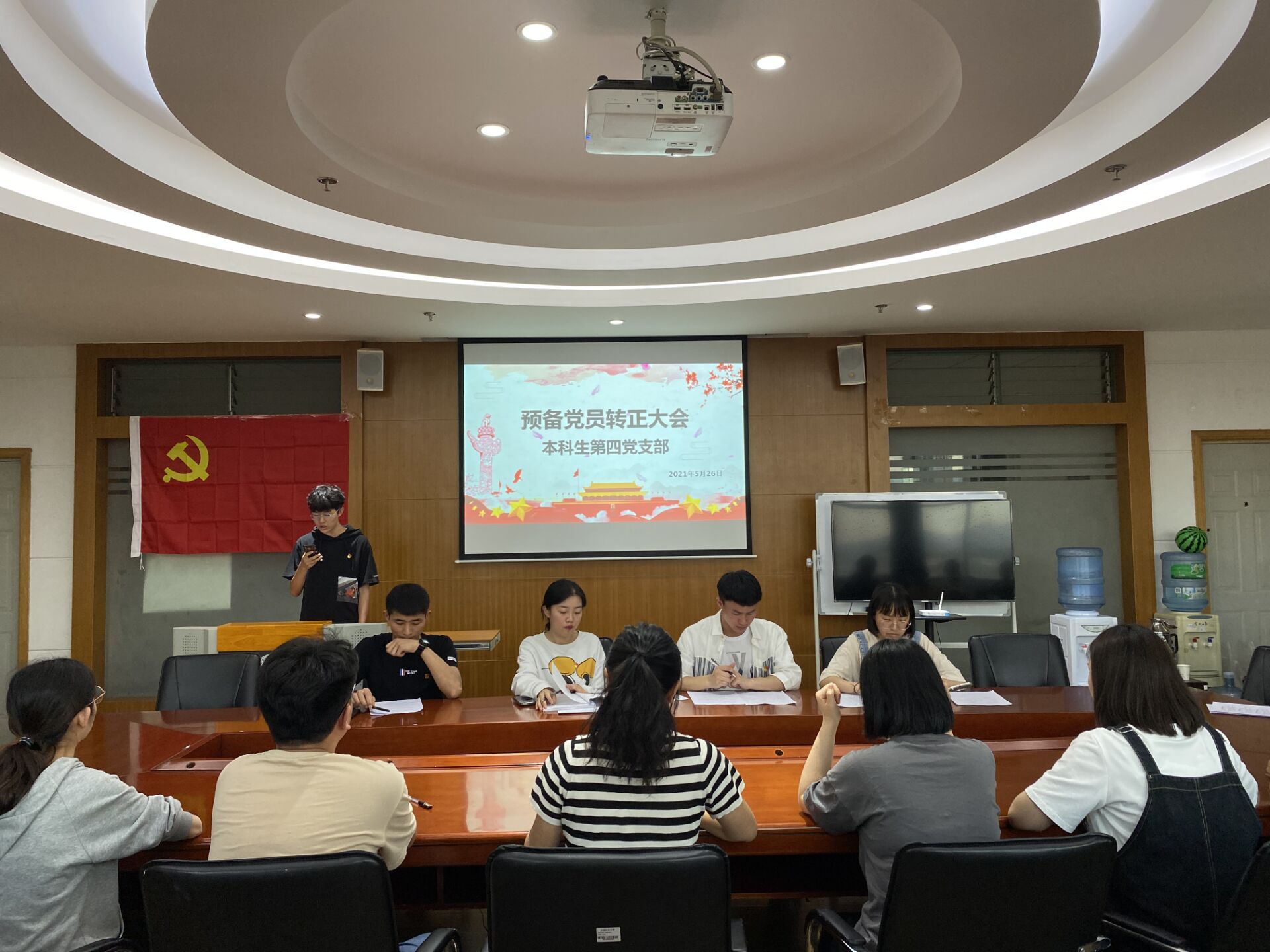 2021年5月26日,本科生第四党支部在逸夫楼923召开预备党员转正大会,本次会议应到正式党员9名,实到正式党员9名,实到正式党员人数超过应到会有表决权党员半数,符合会议流程。