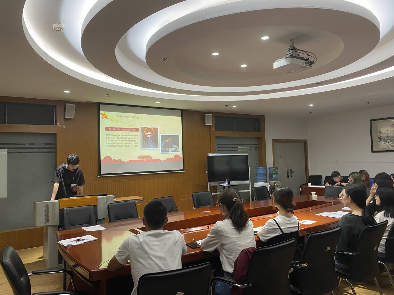 2021年5月12日星期三晚上7点,为提高同志们对于党史的理解和掌握,财政与公共管理学院本科生第四党支部召集全体党员、预备党员、发展对象在逸夫楼923举办了学习中国共产党简史的党课学习活动。本四支部书记葛译遥同志出席本次活动,支部副书记陈智威同志为大家讲解、梳理中国共产党简史内容。