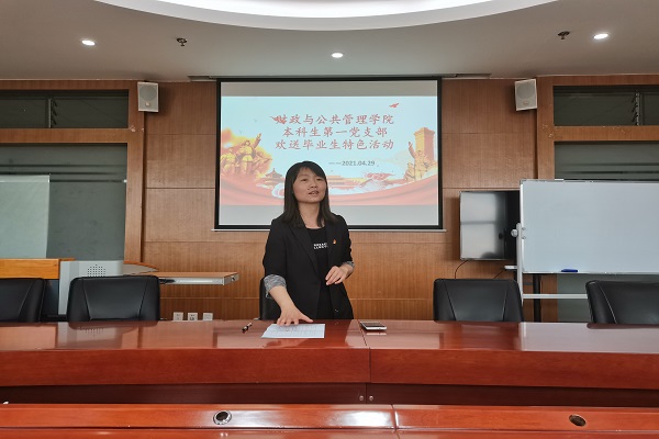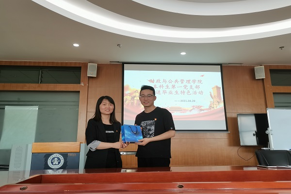 2021年4月29日,为了落实学院党委对做好“毕业生党员离校教育”的要求,同时为方便支部党员间进行交流,做好毕业生离校工作,对其今后的工作发展做好指导工作,财政与公共管理学院本科生第一党支部在逸夫楼923开展了欢送毕业生党员特色活动。