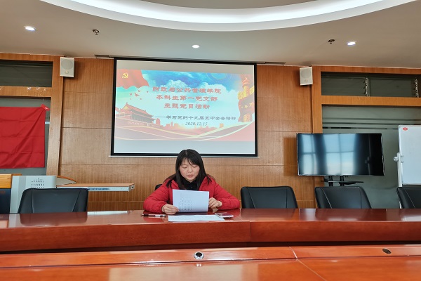 2020年12月15日中午,财政与公共管理学院本科生第一党支部在逸夫楼923召开十二月主题党日活动,活动主题是学习宣传党的十九届五中全会精神。