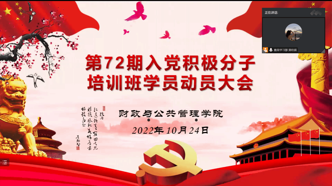 为贯彻落实《中国共产党发展党员工作细则》要求,严把发展党员入口关。2022年10月24日晚,财政与公共管理学院举办第72期入党积极分子培训班学员动员大会,会议由学院组织员李昊哲老师主持,本期共66名入党积极分子全部参加。