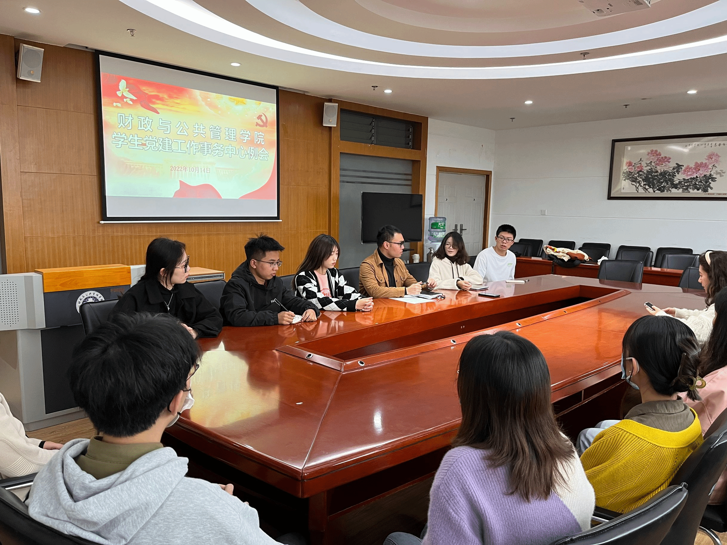 10月14日下午,财政与公共管理学院学生党建工作事务中心在南院逸夫楼923召开本学期第一次工作例会。本次会议由学生党建工作事务中心副主任王睿琰主持,学院组织员李昊哲老师和党建工作事务中心全体成员参加会议。