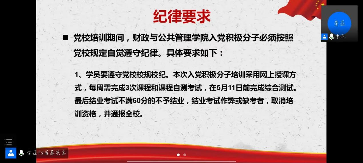 2022年4月8日19:30,财政与公共管理学院于腾讯会议线上开展第71期入党积极分子培训班学员动员大会。本次大会由学院组织员李亚老师主讲,财政与公共管理学院第71期共308名入党积极分子参加。