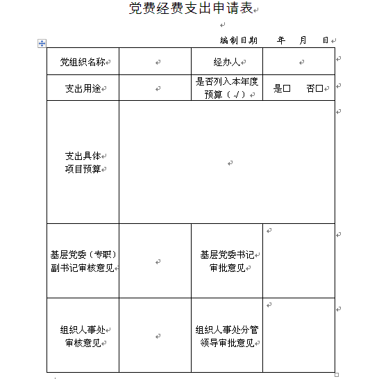党费支出前,要先填写《党费支出申请表》(样表),履行审批手续,说明支出的原因、用途、金额等,按审批权限签批后方可使用。