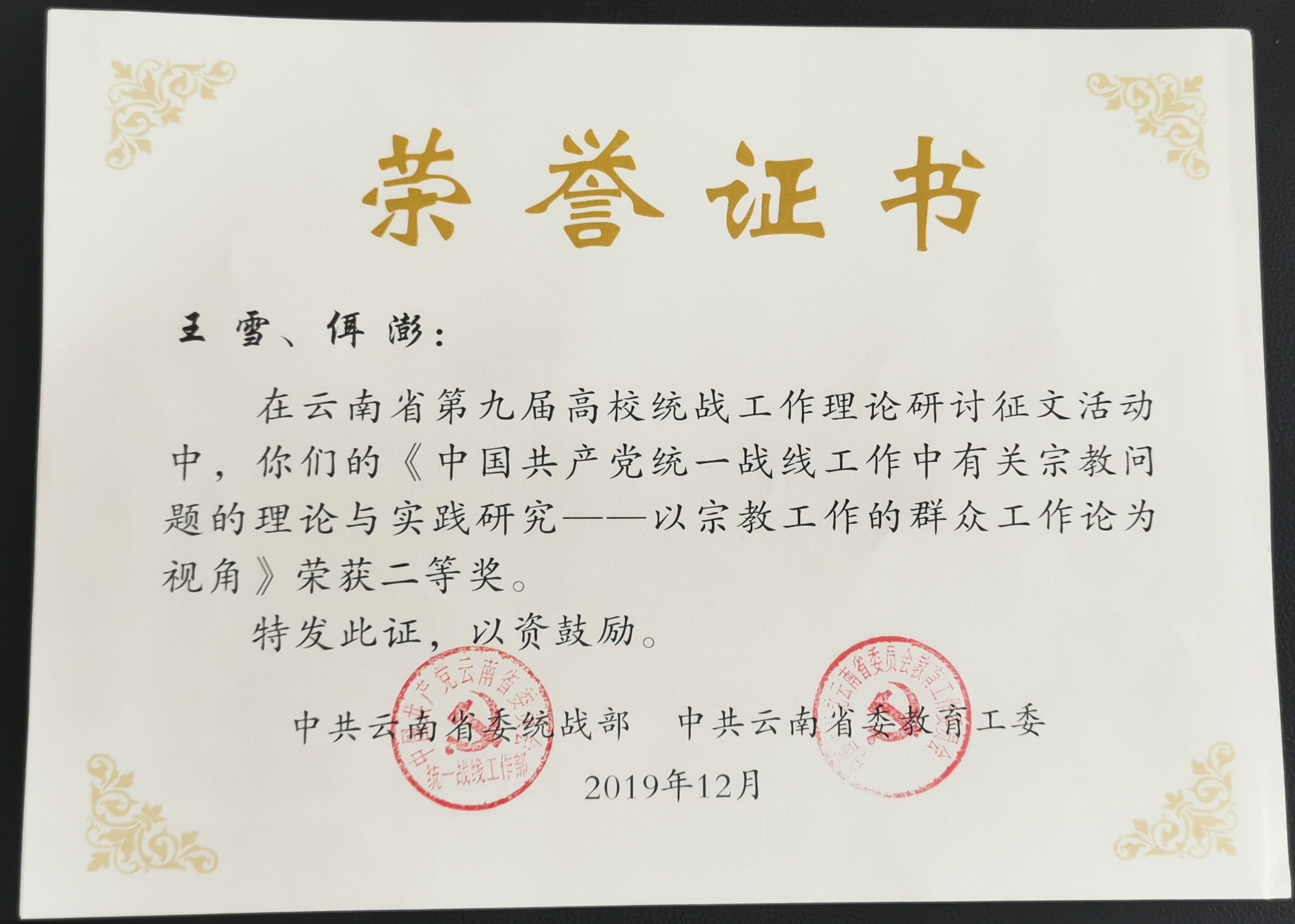 近日,云南省委统战部、省委教育工委下发《关于云南省第九届高校统战工作理论研讨征文活动获奖情况的通报》文件,WilliamHill官方网站教师王雪、佴澎共同完成的论文《中国共产党统一战线工作中有关宗教问题的理论与实践研究——以宗教工作的群众工作论为视角》荣获二等奖。