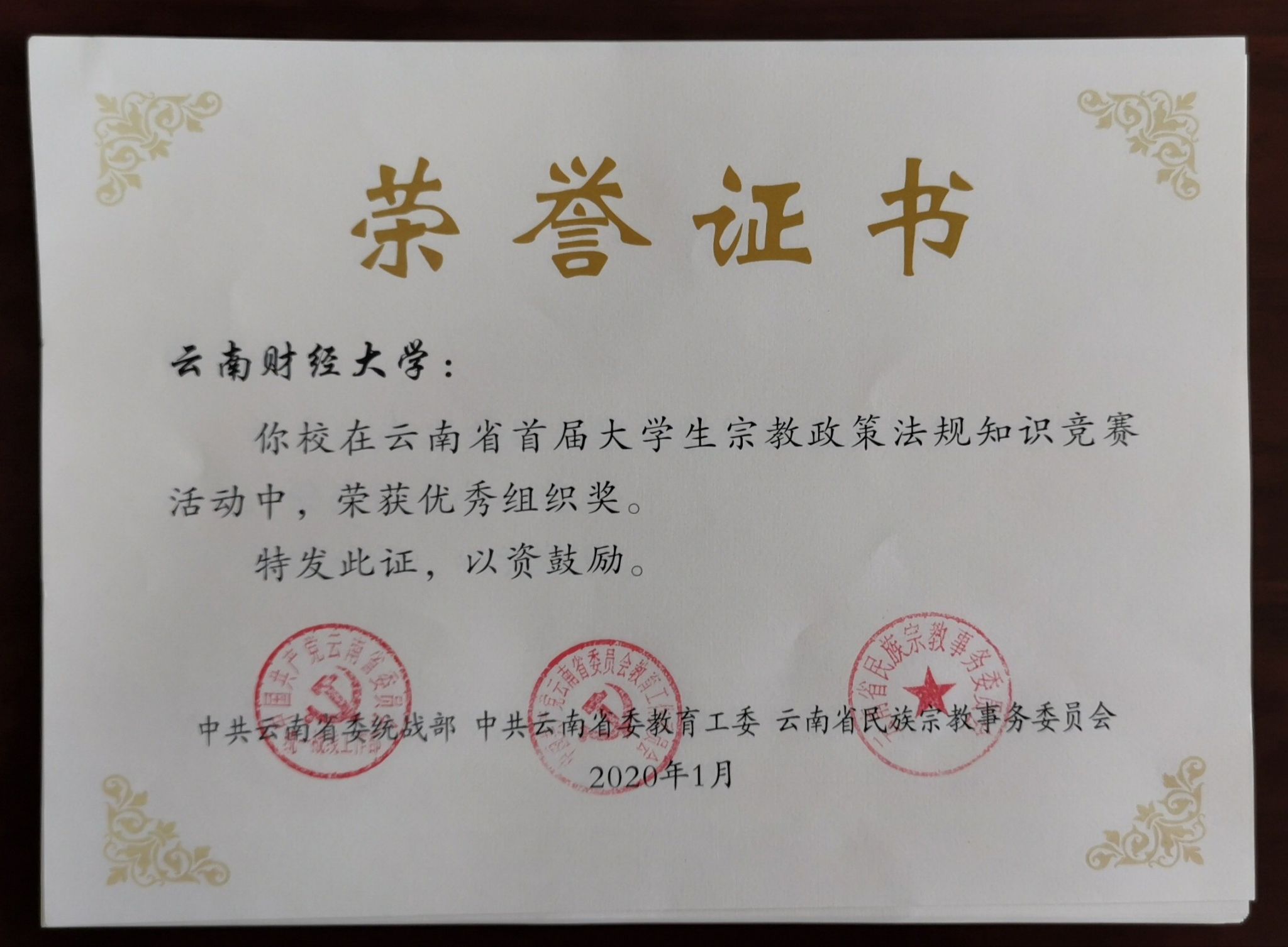 日前,云南省首届大学生宗教政策法规知识竞赛结果公布,WilliamHill官网荣获优秀组织奖,张锦源、李东云、陈琳、农振涛、赵昱权、杨涛等6名同学荣获优秀个人荣誉称号。