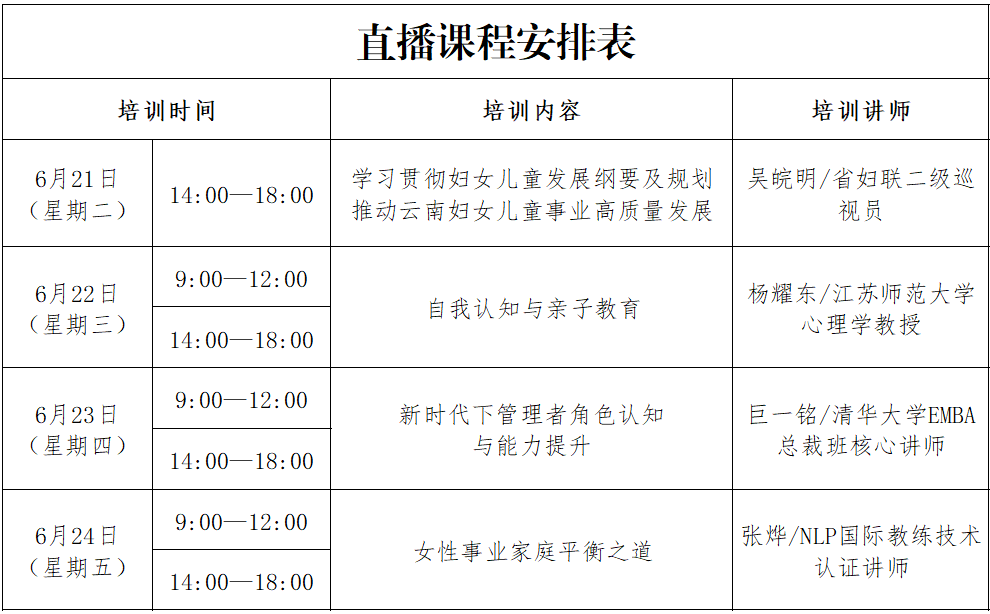 为持续培养工会基层女职工干部的专业能力素养,提升女工主任业务水平、履职能力,云南省总工会女职工委员会将于6月21-24日举办全省工会女职工工作干部线上培训班,持续采用信息化手段开展培训实现培训资源最大化共享,请各工会组织工会、妇联以及各分工会专兼职女性干部积极参加。