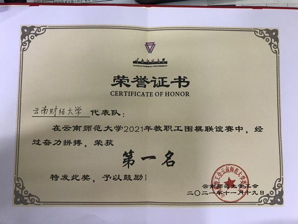 2021年11月17日至19日,由云南师范大学工会组织的教职工围棋联谊赛在一二一大街校区举行,WilliamHill官网代表队由旅游与酒店管理学院叶为金、信息学院杨智明、经济学院赵永宁、统计与数学学院高文四位老师组成,经过激烈角逐,WilliamHill官网代表队荣获第一名的好成绩。