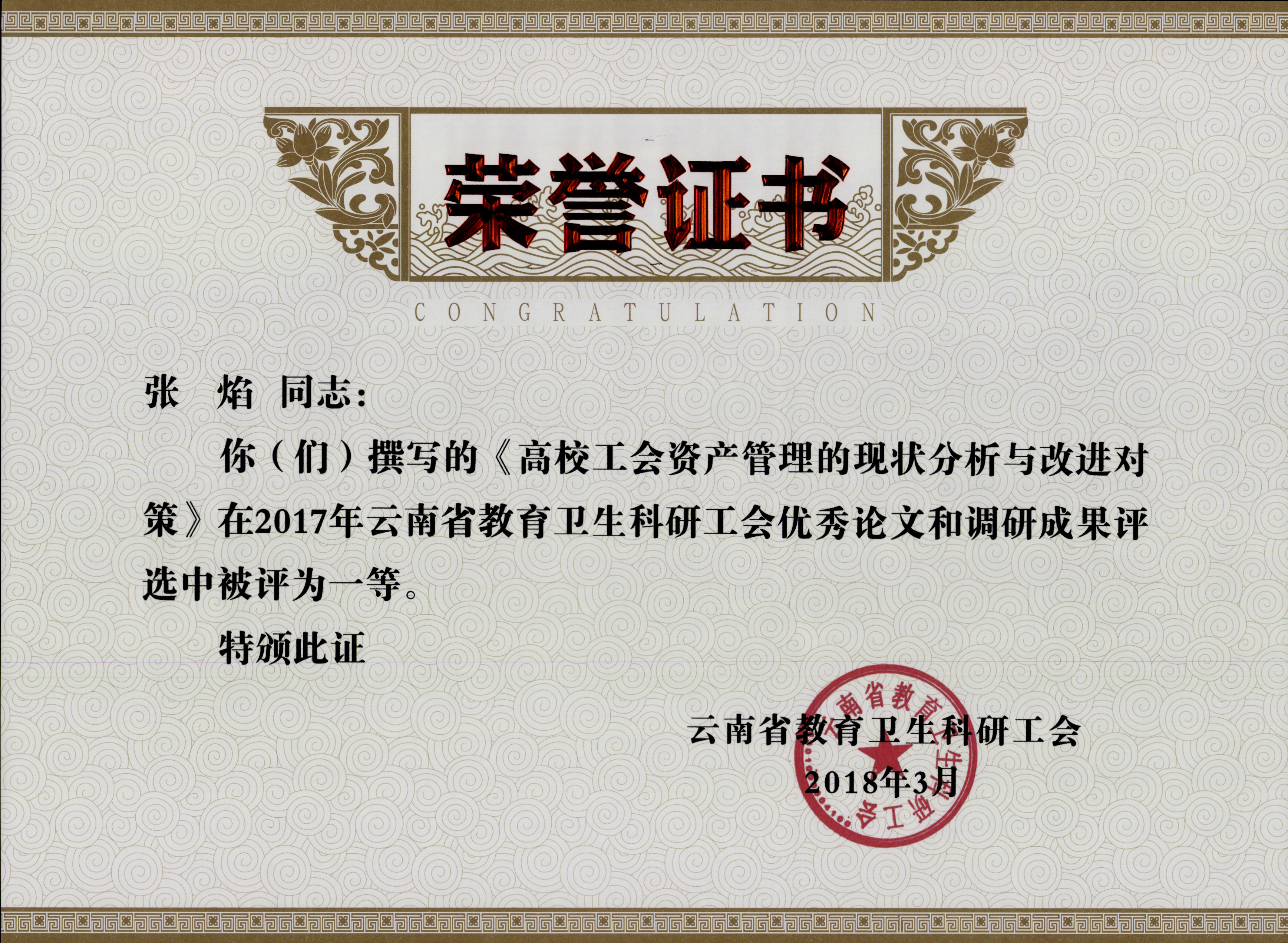 2、张焰 2017年云南省教育卫生科研工会优秀论文和调研成果评选 一等奖 云南省教育卫生科研工会 2018年3月