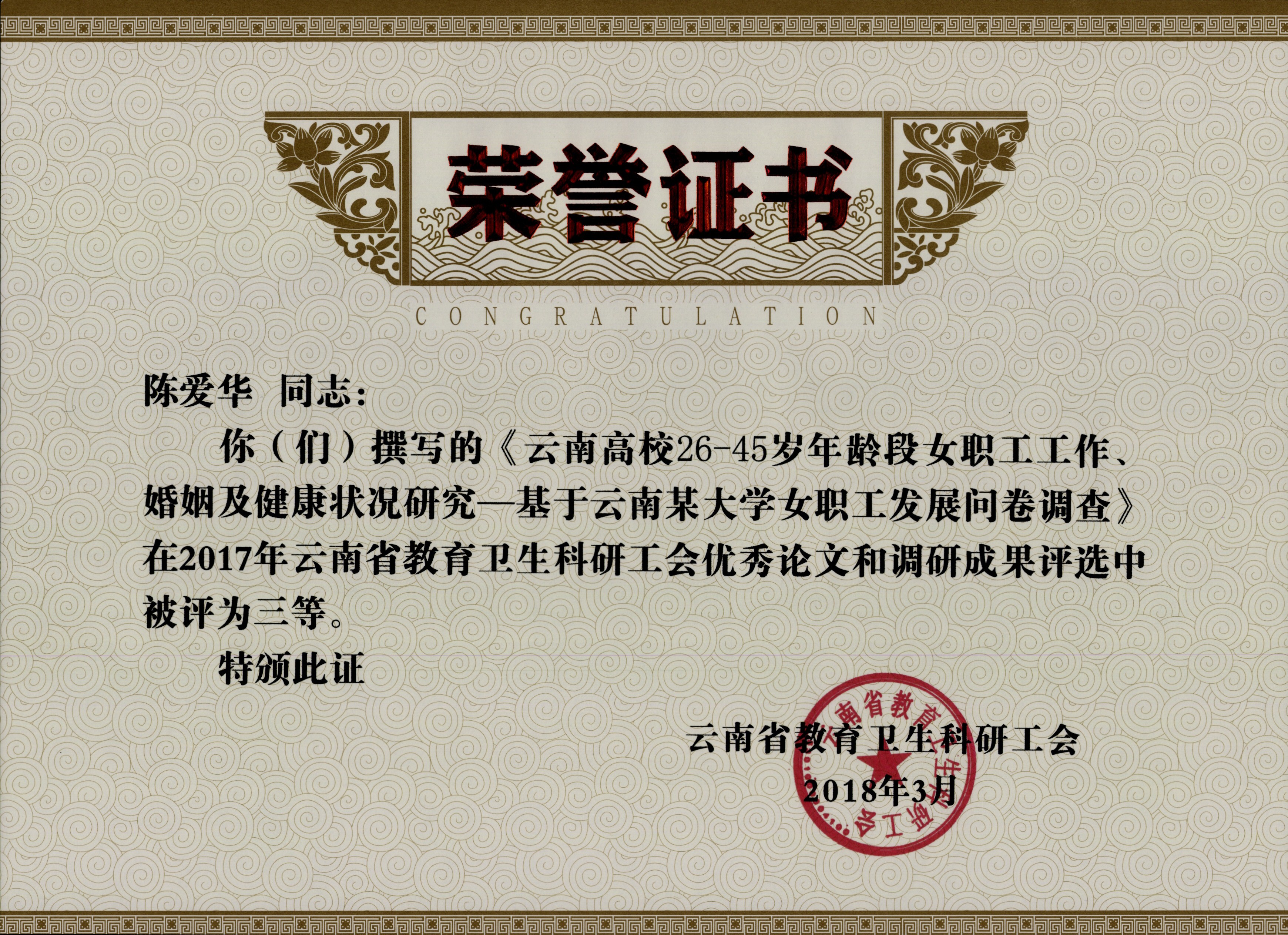 6、陈爱华 2017年云南省教育卫生科研工会优秀论文和调研成果评选 三等奖 云南省教育卫生科研工会 2018年3月