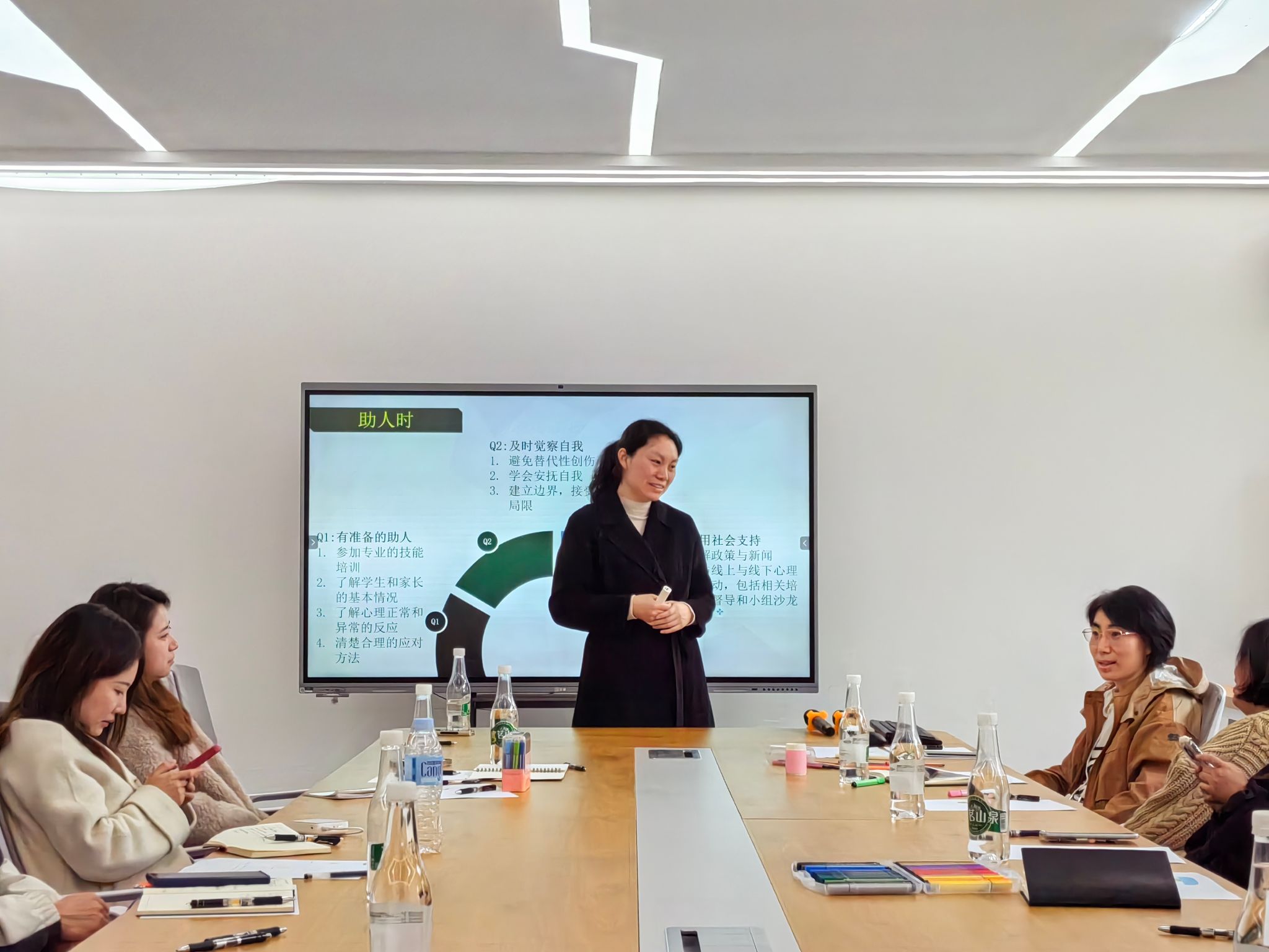 张艳玲以“减压力,爱自我”为题进行专题辅导,通过“雨中人绘画测试”的互动方式来展开压力评估、压力认知、压力处理等讲解。她讲到压力来源于生活、工作、家庭、人际关系等,作为辅导员不仅要处理好学生日常心理危机,也要认识自己、接纳自己、爱自己,做有准备的助人者,做到及时观察自我,善于利用社会支持缓解压力。最后,她用光柱技术的释放方法让老师体验了催眠解压。
