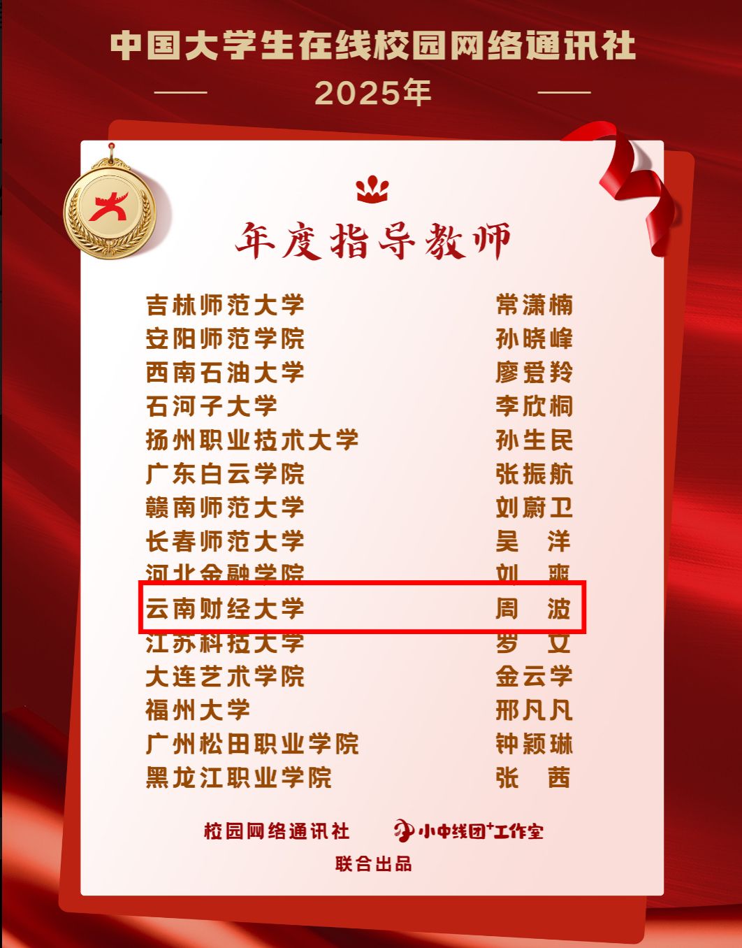 近日,教育部“中国大学生在线”公布了2025年度校园网络通讯社评选结果,WilliamHill官网师生团队荣获4个奖项。学校获“2025年度校网通站”“年度网络文化活动优秀组织高校”;学生处思想政治教育中心(辅导员发展研究中心)周波老师获“年度指导教师”称号;国际工商学院金英24-1班郭兆熹同学获“年度学生通讯员”称号。