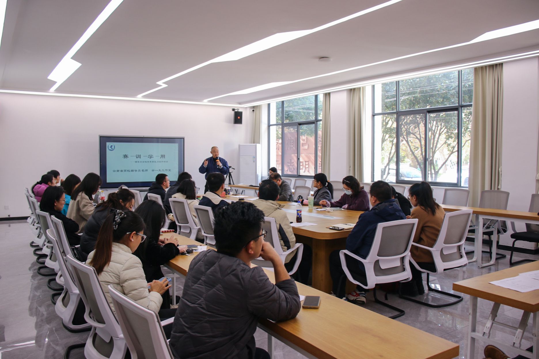 余一夫以“‘赛-训-学-用’辅导员全链条素质能力提升”为主线,聚焦辅导员素质能力大赛核心要求,对大赛理论测试、案例研讨、谈心谈话等关键环节难点与重点提供了专业指导,同时结合自身丰富的工作经验与实际案例,对辅导员如何坚守职业守则、把握学生成长规律、做好学生思想引领做了讲解。他鼓励全体辅导员以赛促学、以赛代训,努力提升自身职业素养,成为学生思想引领的践行者、学生情况的熟知者、成长成才的守护者、日常事务的组织者以及职业就业的指导者。