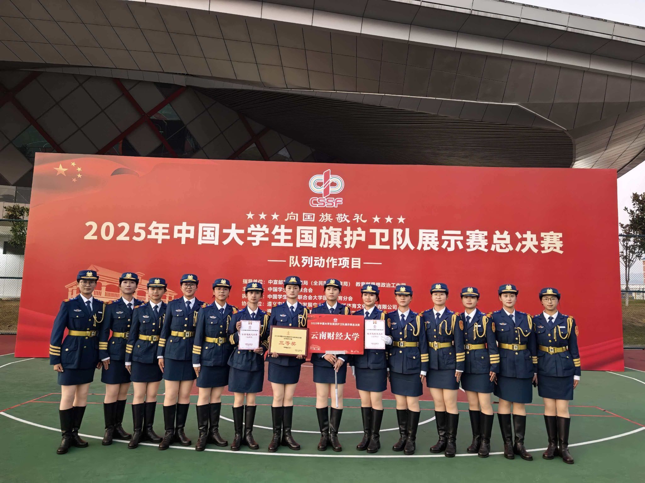 11月28日,2025年中国大学生国旗护卫队展示赛(总决赛)在贵州遵义奥体中心圆满落幕。学校强军社国旗护卫队凭借过硬的军事素养与出色的现场发挥,在女子甲组队列动作展示项目中斩获三等奖,用青春风采诠释了国旗卫士的使命担当。