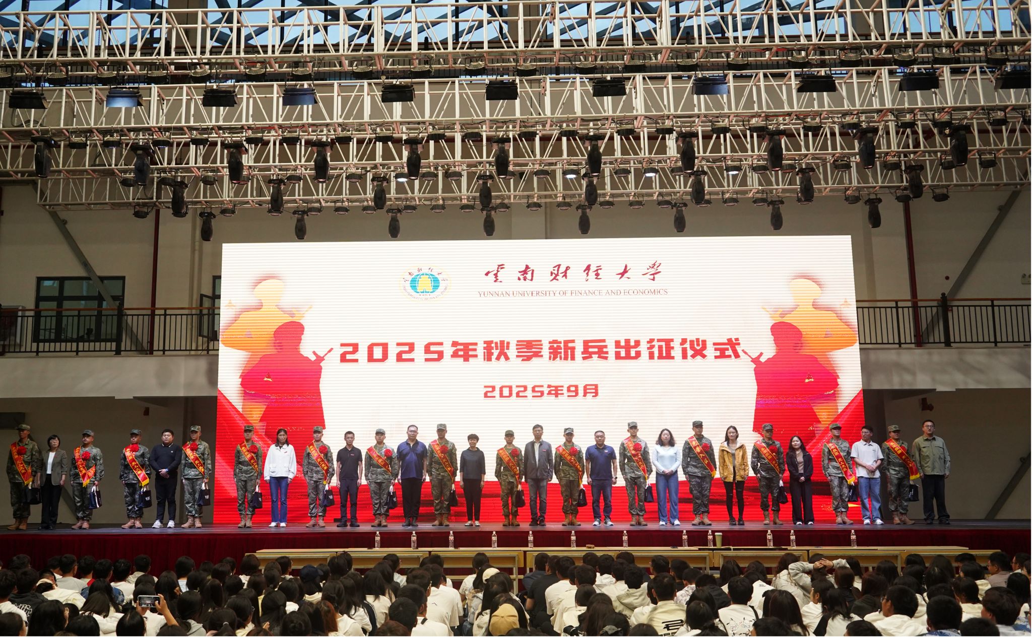 9月14日晚上,学校在安宁校区体育馆隆重举行2025年秋季新兵出征仪式,为即将奔赴军营的15名优秀学子送行。新兵家长、学校武装部、新兵所在学院党委副书记、辅导员老师,以及强军社学生和安宁校区2025级全体新生共同见证了这一庄严时刻。