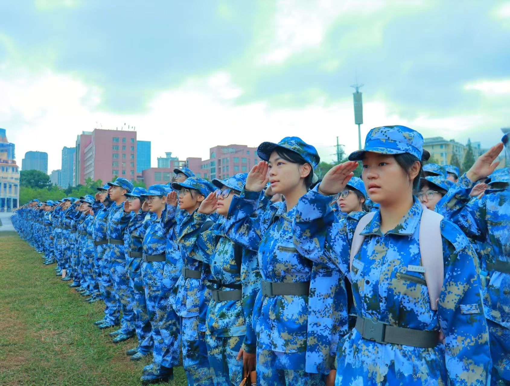 清晨,同学们身着迷彩服,精神抖擞地集合在各校区的升旗场地。伴随着激昂的国歌旋律,五星红旗冉冉升起,全体新生肃穆而立,向国旗行注目礼,齐声高唱国歌,嘹亮的歌声在校园上空回荡。