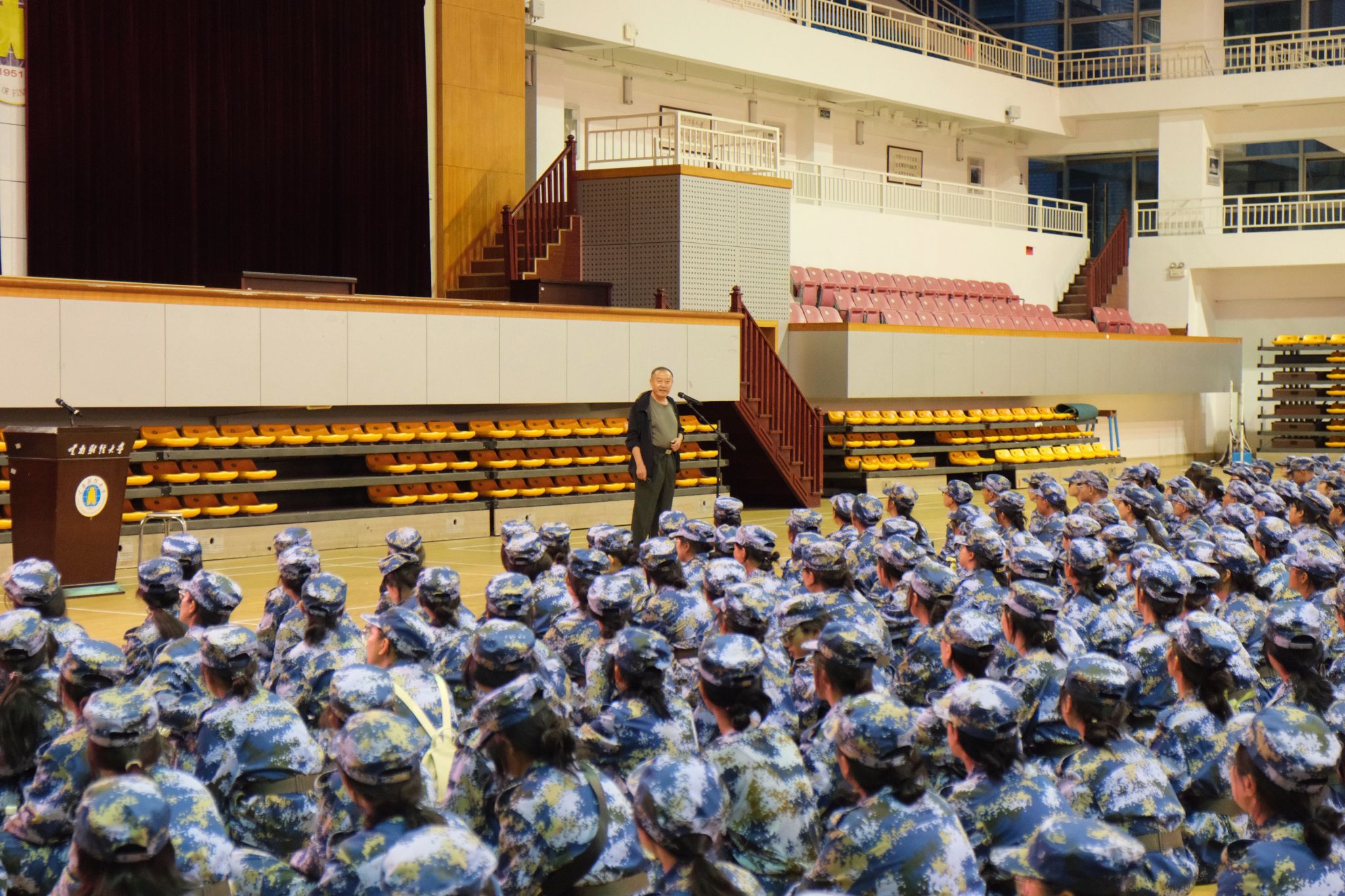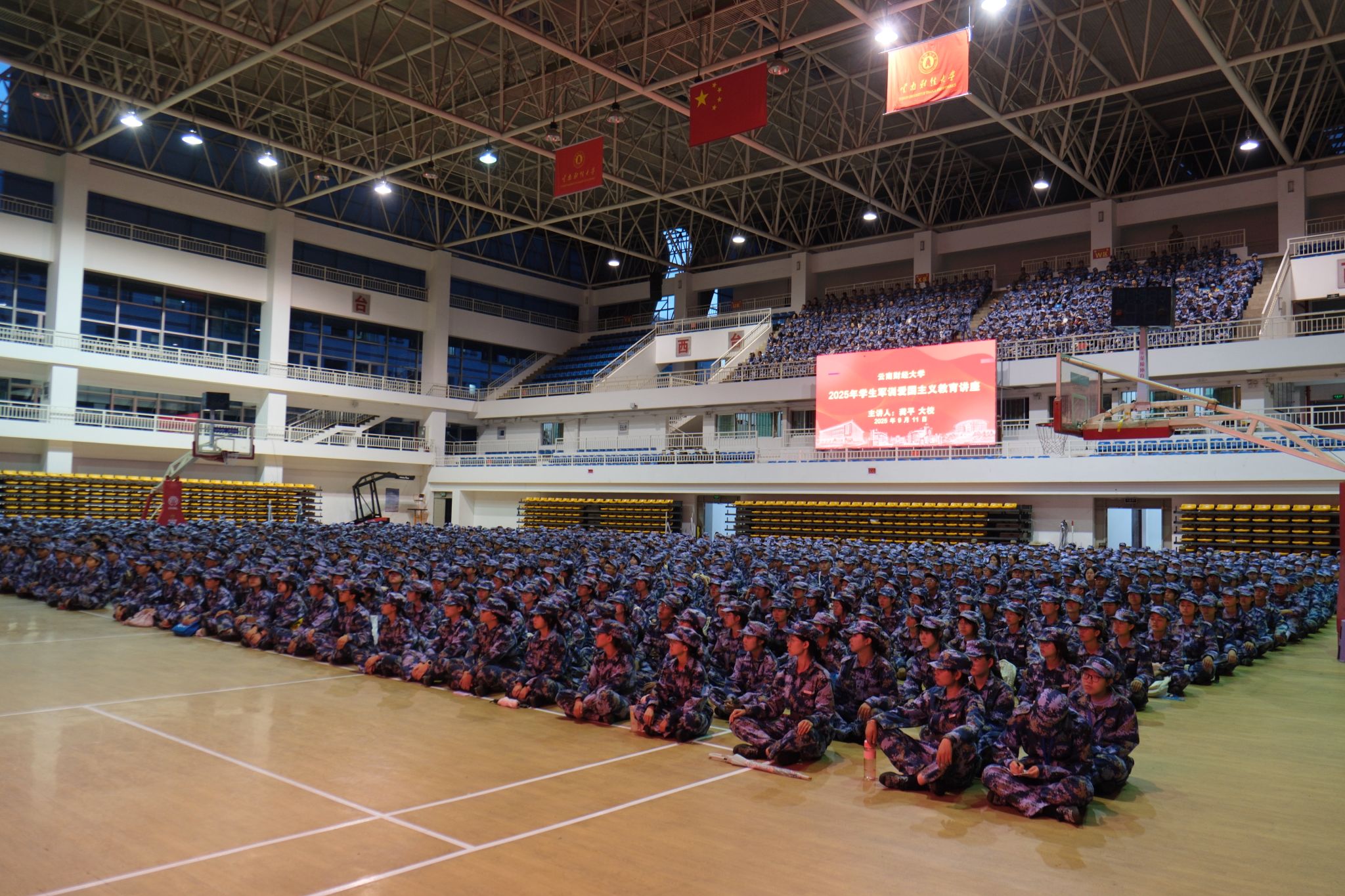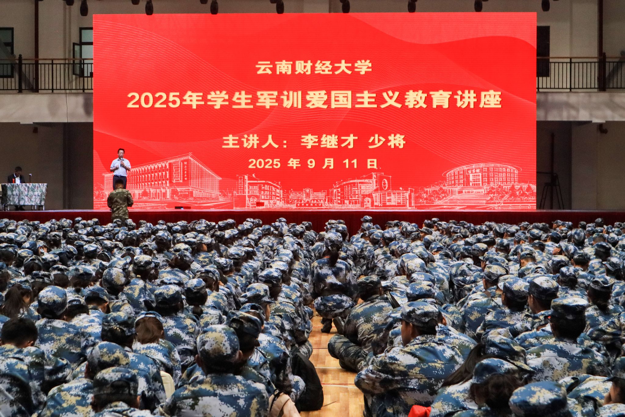 为进一步引导同学们厚植爱国情怀,深化爱国主义教育和国防教育,9月5日、11日,在纪念中国人民抗日战争暨世界反法西斯战争胜利80周年之际,云南省军区原副政委李继才少将、原副参谋长龚平大校先后应邀到学校龙泉路校区南院体育馆、安宁校区体育馆作了4场爱国主义教育主题讲座。讲座由学校党委副书记施仲军主持,2025级8000余名新生现场聆听讲座。讲座间隙,李继才少将、龚平大校参观了学校校史馆。