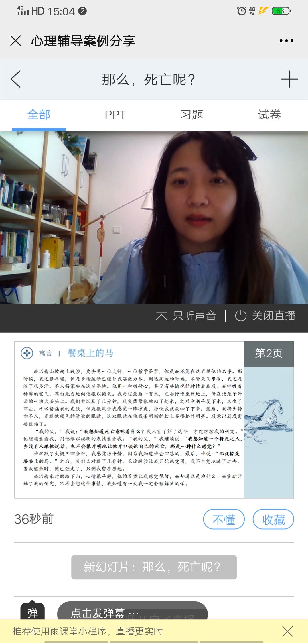 本次主讲老师龙茜以寓言故事《餐桌上的马》起头,结合自己在咨询中接到的个案,与参训老师们分享了怎样帮扶遇到亲友亡故的学生、如何在危机干预中谈生死,并在最后回答了参训老师们的弹幕提问。“死亡是一个不招人喜欢,但却无法回避的话题”,参训老师赵毅媛反馈,“就像‘餐桌上的马’,当我们正视和以适当的方式讨论它,就可以调整它对我们的影响。”