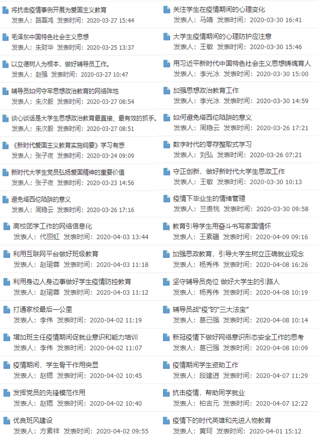 WilliamHill官网专职辅导员积极参加培训学习,学习热情高涨,积极交流分享学习心得。截至目前,已有81人次发帖进行主题研讨,30余人次跟帖讨论,34名辅导员撰写学习心得。辅导员们主要围绕“疫情期间如何做好学生思想政治教育工作、如何加强疫情期间学生心理健康教育、如何有效加强班级管理、如何开展大学生理想信念教育和爱国教育、坚守辅导员岗位、新时代青年的责任与担当”等主题开展研讨学习。