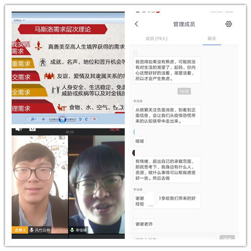 其次,李佳峰老师结合个人多年从事心理咨询与辅导的工作经验,通过了解疫情对同学们生活学习等各方面的影响。有的同学反馈认为自己在疫情期间非常焦躁不安,情绪激动易怒,无法静下心学习;但有的同学反馈在疫情期间能够静下心来,积极利用时间培养兴趣爱好,认真学习,既开拓了视野,也提升了自己。之后李佳峰老师从马斯洛需求层次理论切入,认为此次新冠肺炎疫情对我们每位同学或多或少都会产生影响,有消极的但也有积极的,比如对生活、生命的掌控感与人的情感联结受到破坏,有强烈的无力、孤独感受,产生抑郁、焦虑等情绪反应,但这些都是疫情期间正常的心理应激反应。