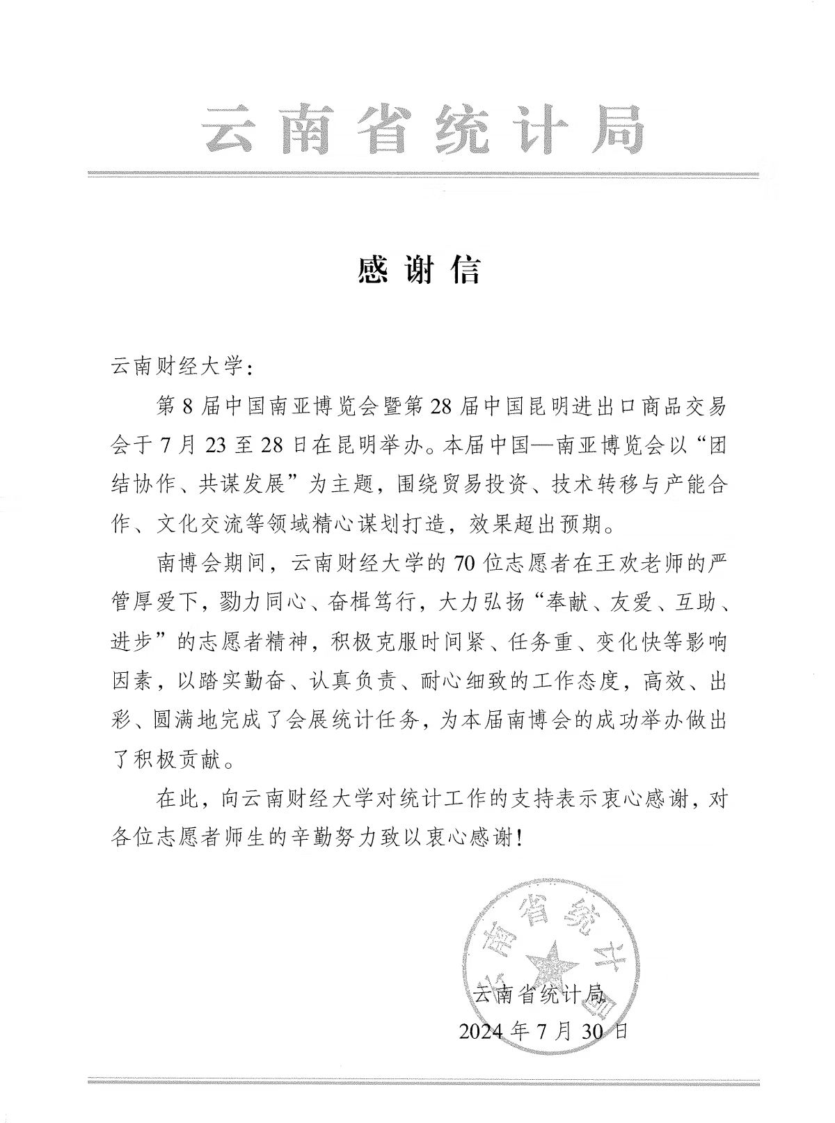 近日,省统计局向WilliamHill官网发来感谢信,向WilliamHill官网对第8届中国—南亚博览会暨第28届中国昆明进出口商品交易会的支持表示感谢,对WilliamHill官网志愿者给予高度赞扬。